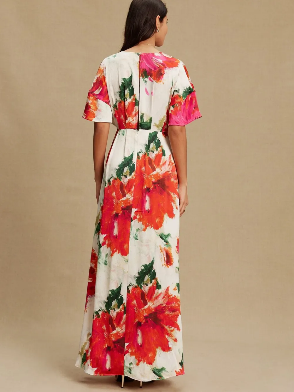A beautiful floral kaftan perfect for special occasions, this maxi dress combines effortless comfort with chic, feminine style. Crafted from luxurious textured satin, the lightweight and flowy silhouette is elevated by a deep V-neckline that adds a touch of elegance. Textured satin Deep V-neckline Floral Kaftan Maxi dress Regular side neck to hem 56.5″ / 143cm. Machine washable. 51% Recycled polyester, 47% Polyester, 2% Elastane. Items with the curve logo are available in sizes 18 and above., Our tall collection is designed to fit women 5’10” and above. This has been proportionally increased through the body, leg and sleeve to achieve the perfect fit. Available in sizes 8-20.