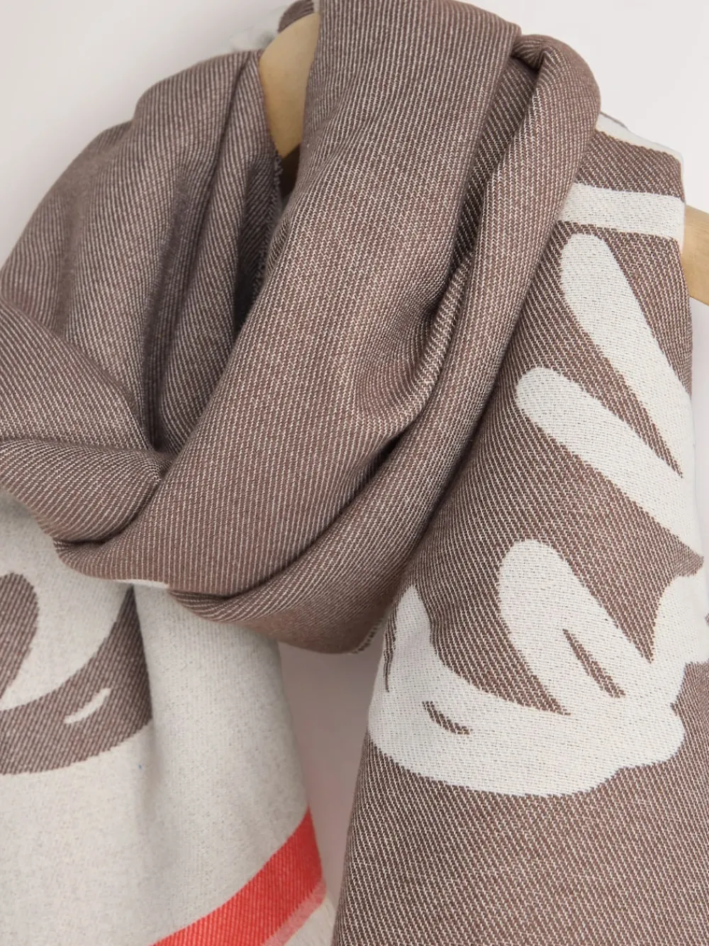 Wrap up in this charming midweight scarf, featuring the adorable ‘Hamish the Highland Cow’ print in ecru and brown. The large scale graphic and bold coral trim add a playful, modern contrast. Its soft, comfortable feel makes it an ideal accessory for adding character and warmth to your cold-weather look. Midweight base Highland Cow (‘Hamish’) print Ecru and brown colours Coral trim detailing Soft woven fabric Fringed edges Versatile accessory Length 180cm Width 70cm 100% Recycled polyester.