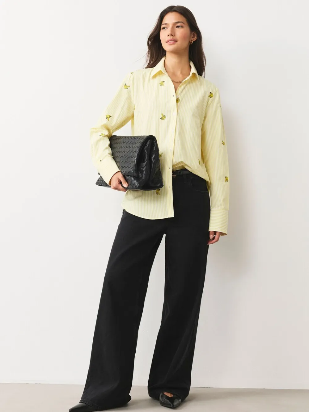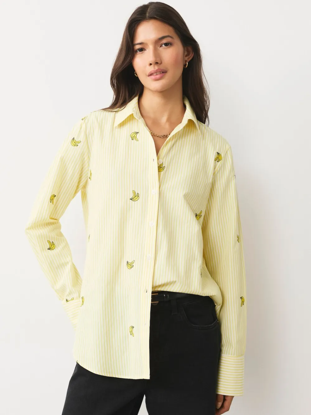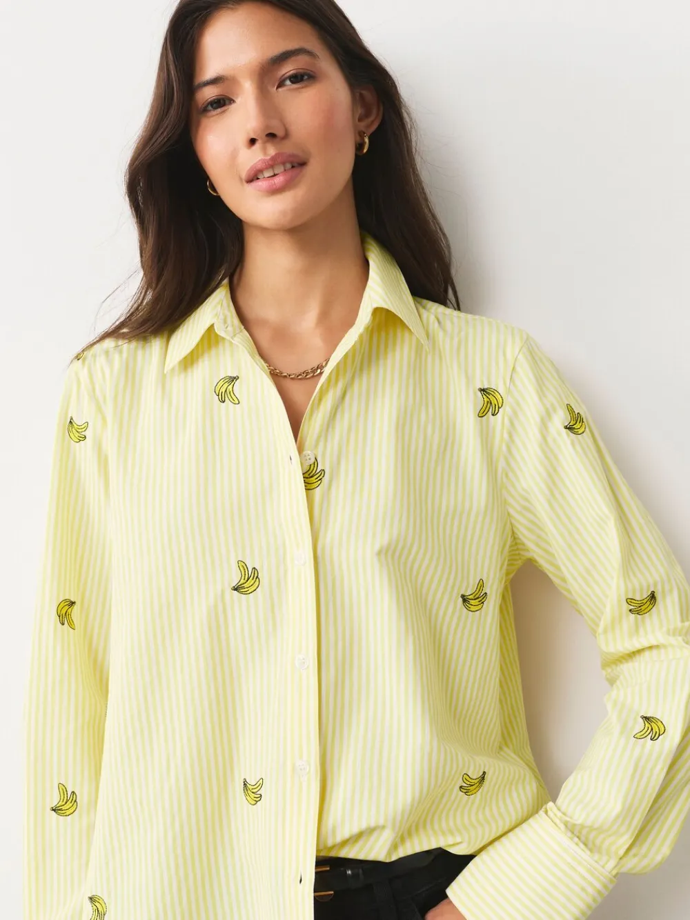 A fun twist on the classic stripe shirt, this piece features charming embroidered banana motifs scattered across the fabric. The bright yellow and white stripes create a perfect summer shirt staple. An effortless, on-trend piece to wear every day, easily styled with your favourite denim. Long sleeves Yellow and white stripe print Scattered banana embroidery Button-down fastening Machine washable. 58% Polyester, 42% Cotton. Items with the curve logo are available in sizes 18 and above.