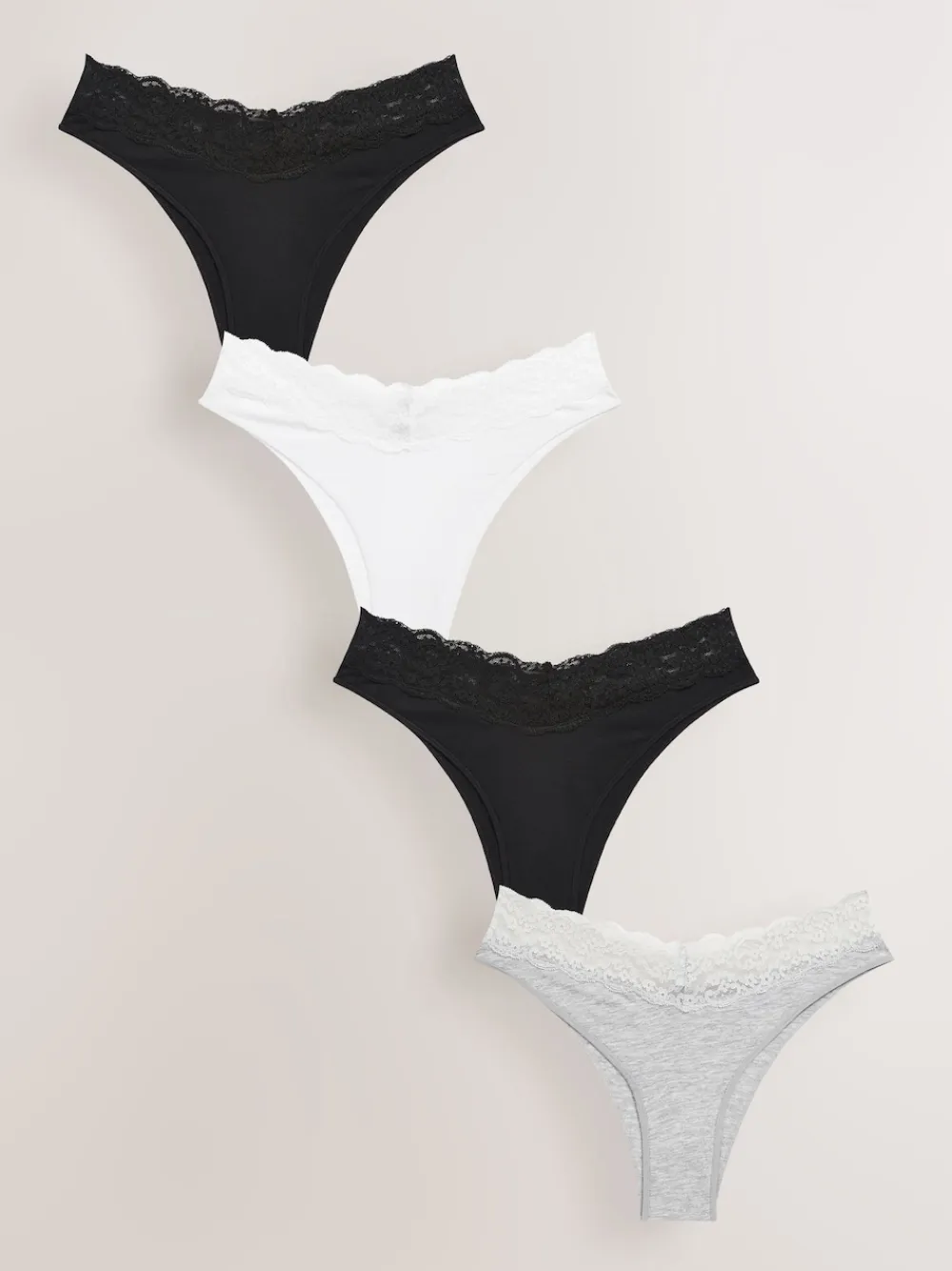 Next Extra High Leg Cotton Lace Knickers 4 Pack White/Black/Grey New