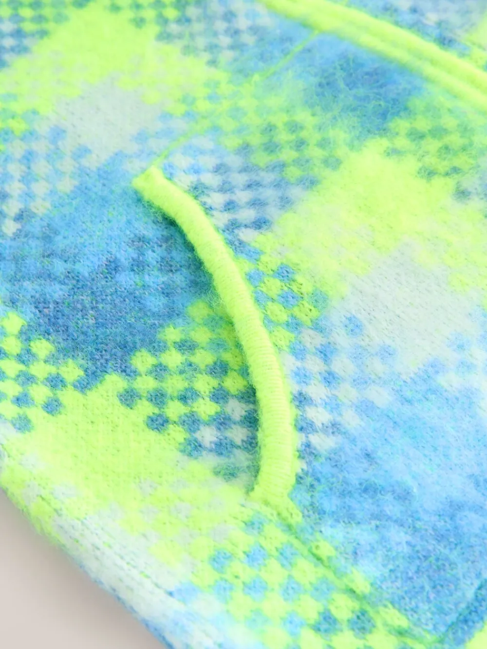 Brighten up your outdoor or loungewear wardrobe with this eye-catching gilet. This sleeveless layer features a bold, oversized check pattern in a vibrant fluorescent lime green and cool blue palette. Designed with a soft, brushed knit texture for added warmth, it includes a high funnel neck and a full-length zip-up front with a coordinating neon green trim. Check pattern Sleeveless Zip Neck Funnel Collar Two curved front pockets Neon trims Brushed Knit Machine washable. 55% Recycled polyester, 28% Acrylic, 14% Nylon, 3% Elastane.