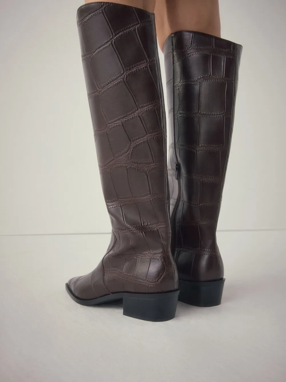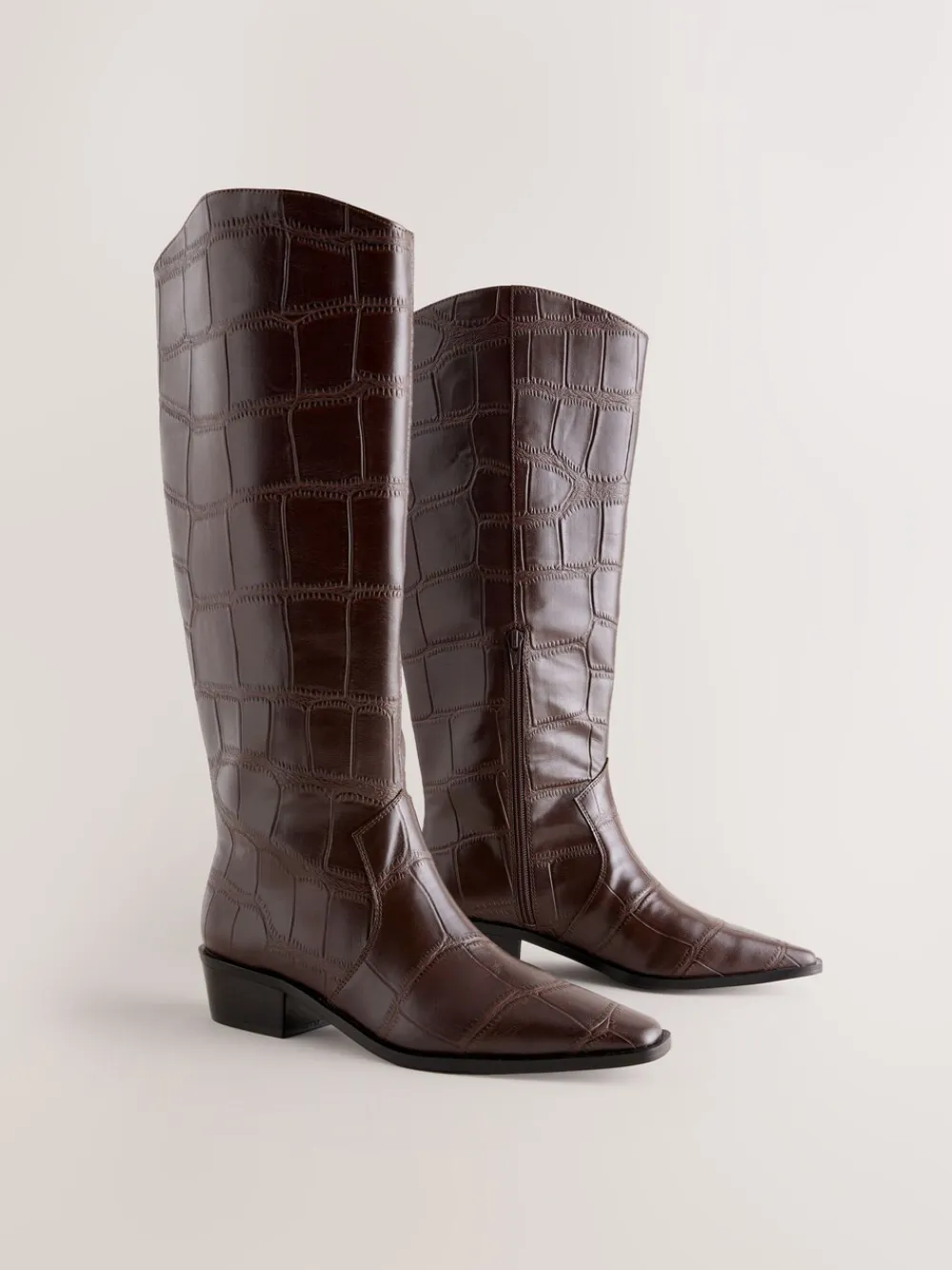 Next Forever Comfort® Chisel Toe Knee High Boots Chocolate Brown Croc Embossed New