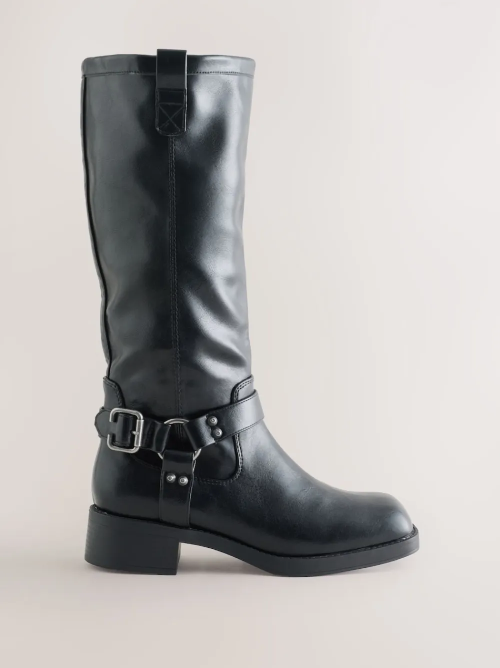 Step into rugged style and comfort with these Forever Comfort® Knee High Biker Boots. Featuring our Forever Comfort® insole, these boots are made for all-day wear. They boast classic biker style with striking hardware harness detailing and a contemporary square toe. Forever Comfort® cushioned insole Hardware harness detailing Pull-on tab Square toe Knee-high length Heel height 4cm. Upper – Other Materials, Lining & Sock – Textile, Other Materials, Sole – Other Materials.