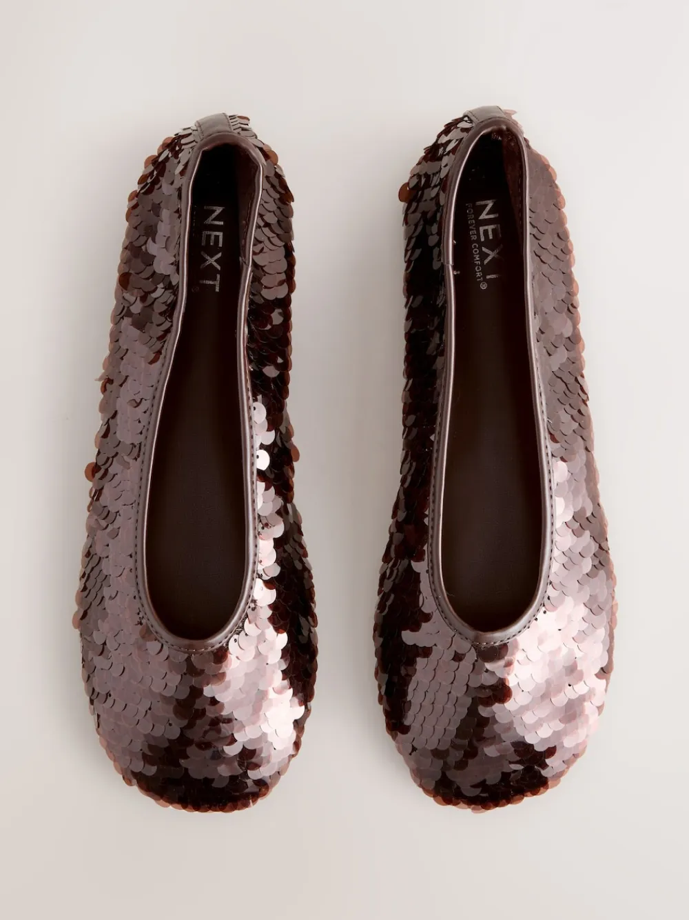 Shine at any occasion in these glamorous Chocolate Brown Sequin Forever Comfort® Round Toe Sequin Ballerina Flats. The all-over sequin upper delivers a dazzling touch of glitz. Designed for all-day elegance, the slip-on style features a classic round toe and superior cushioning from the Forever Comfort® padding. Sequin upper Round toe Slip-on style Forever Comfort® padding Upper – Textile, Lining & Sock – Textile, Other Materials, Sole – Other Materials.