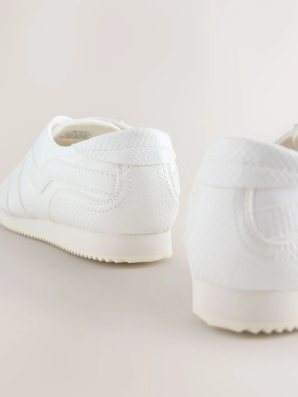 Step into sleek, all-day comfort with these White Forever Comfort® Slimline Side Stripe Lace Up Trainers. Featuring a modern slimline shape, the trainers blend a snakeskin texture detailing with other materials for a chic, contemporary look. The lace-up design provides a secure fit, while the Forever Comfort® padding ensures superior cushioning. Forever Comfort® padding Snakeskin detailing/material mix Slimline shape Lace-up design Upper – Other Materials, Lining & Sock – Textile, Sole – Other Materials.