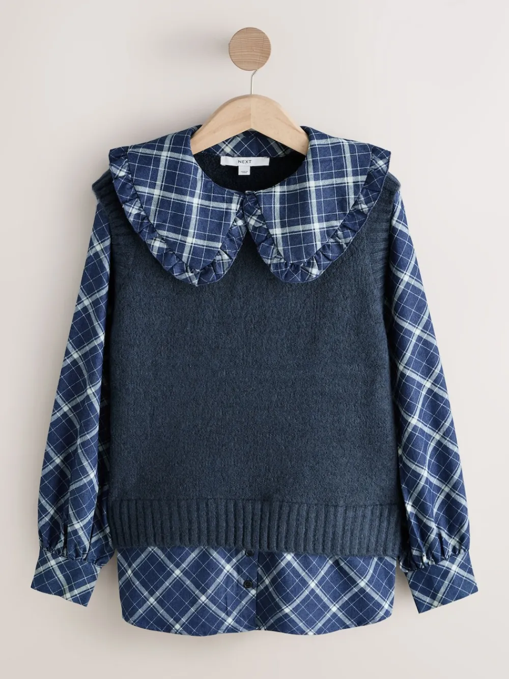 Next Frill Collar Shirt Layer Knitted Tank Blue Check Hot