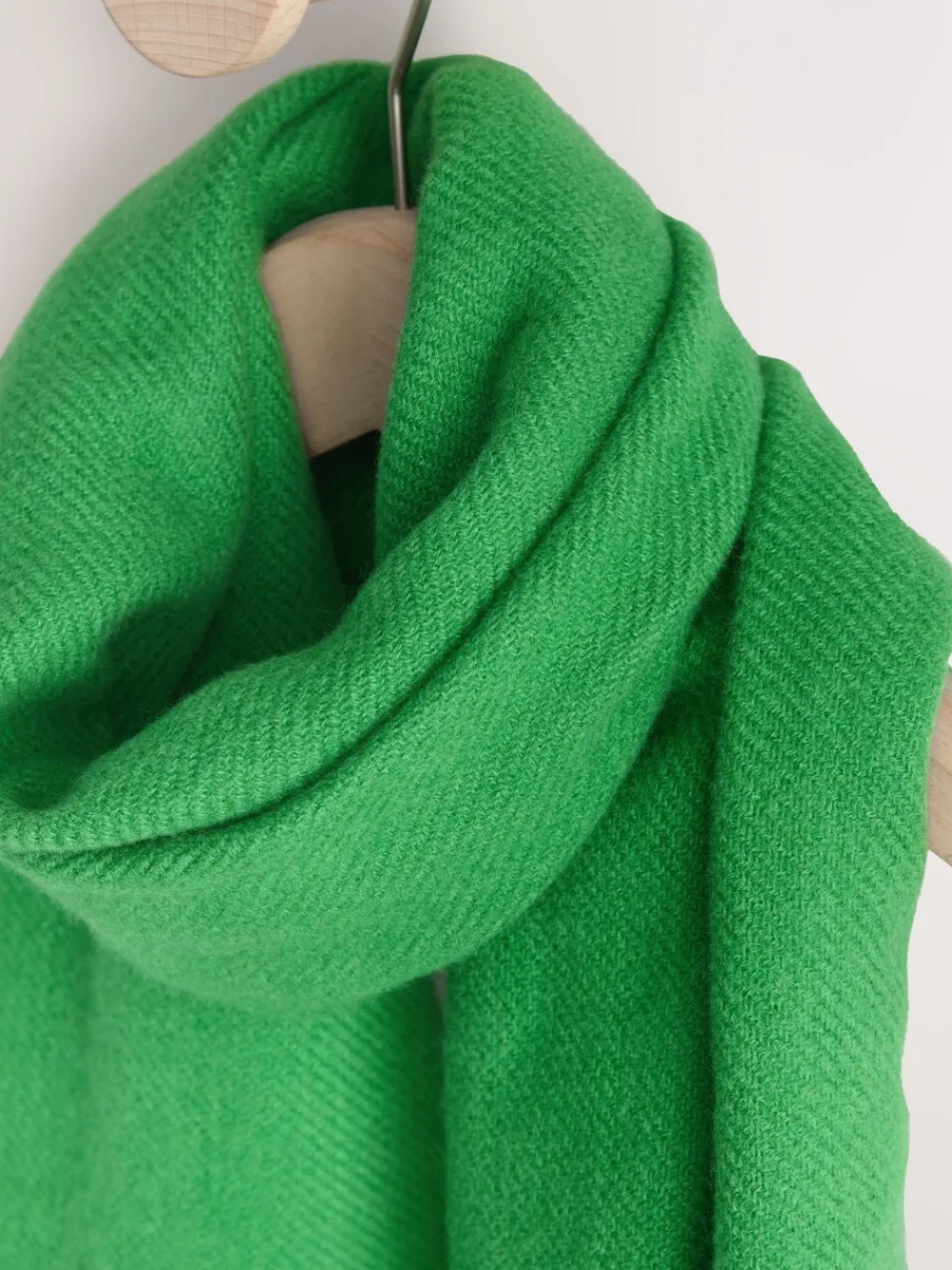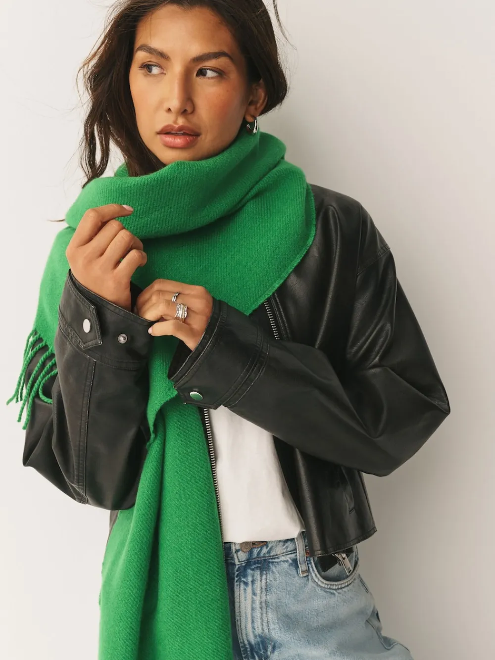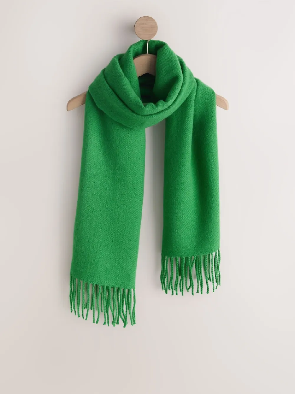 Inject a burst of colour into your look with this vibrant green scarf. Crafted from a cosy midweight wool blend, it features a simple, elegant fringed hem for a classic finish. Perfect for adding exceptional warmth and a statement shade to elevate your everyday winter style. Midweight wool blend Fringed hem Plain design 39% Recycled polyester, 24% Wool, 18% Acrylic, 13% Viscose, 6% Nylon.