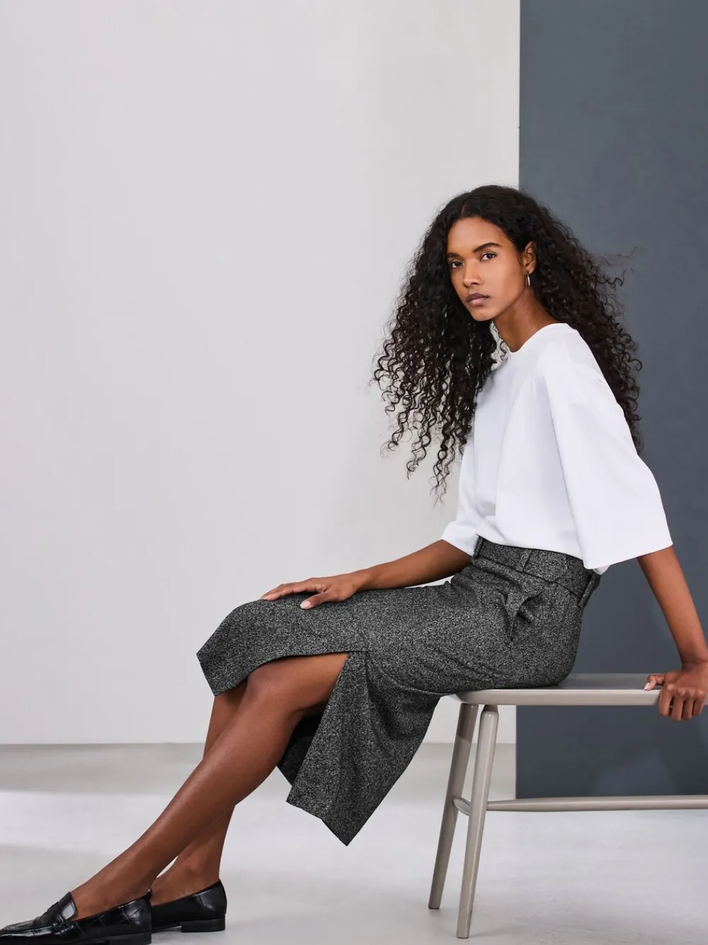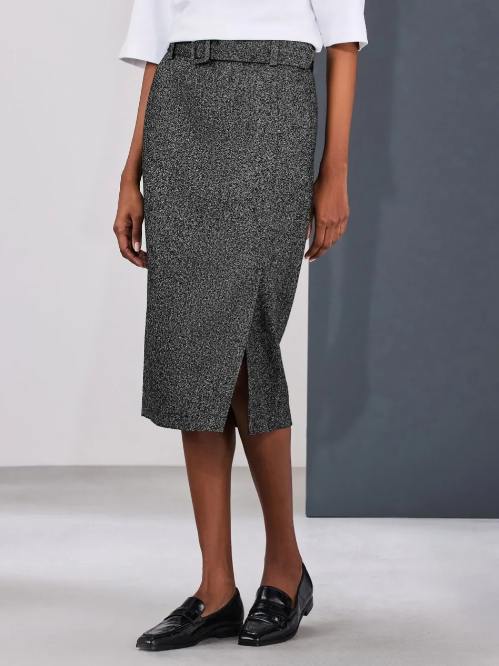 This sophisticated grey pencil skirt is a timeless addition to your professional wardrobe. Crafted with a smart flecked finish, the tailored pencil shape offers a refined and flattering silhouette that sits at a classic knee length. The matching belted waist adds a polished final touch for effortless office styling. Pencil shape Knee length Belted waist Regular waistband to hem 27″ / 68cm. Machine washable. 73% Recycled polyester, 26% Viscose, 1% Elastane. Items with the curve logo are available in sizes 18 and above., Our tall collection is designed to fit women 5’10” and above. This has been proportionally increased through the body, leg and sleeve to achieve the perfect fit. Available in sizes 8-20.
