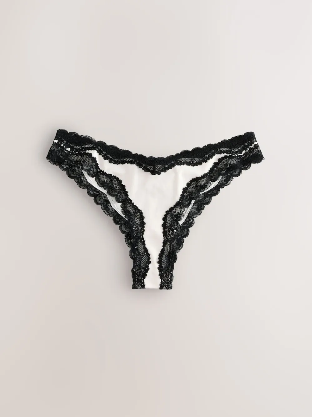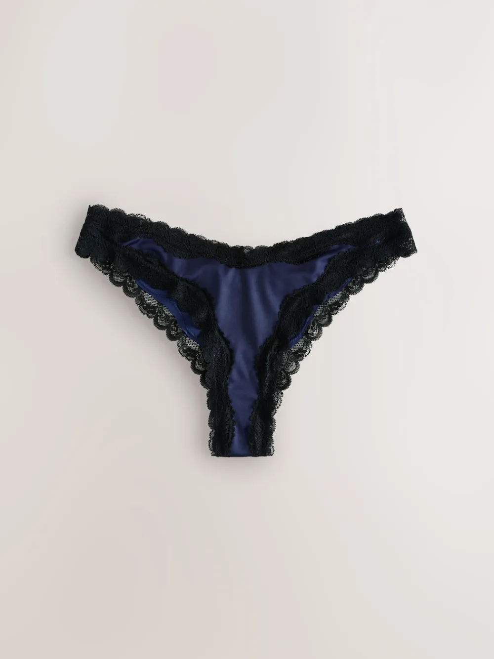 Next High Shine & Lace Trim Brazilian Knickers 2 Pack Navy/Champagne New