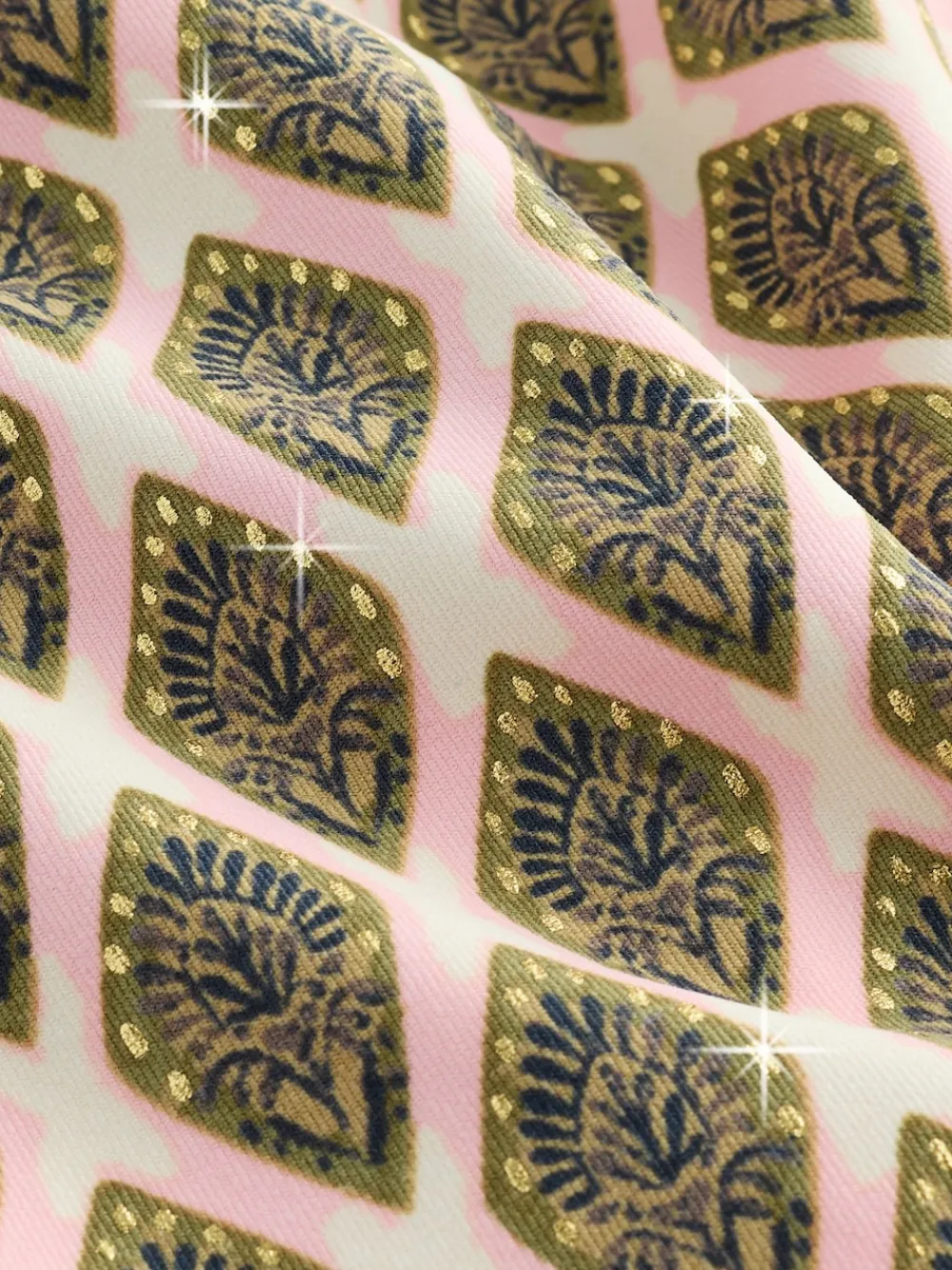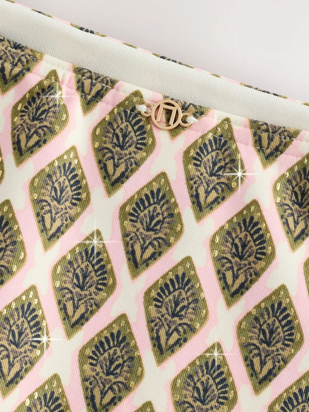These high leg bikini bottoms feature a stylish khaki and cream woodblock print with foil detail. The improved fit has a slightly higher rise for a more flattering look. Crafted from fabric providing SPF 50+ protection, they offer essential sun safety without compromising on style. High leg cut Improved, slightly higher rise fit Khaki/cream woodblock foil print Provides SPF 50+ protection Main 85% Nylon, 15% LYCRA® XTRA LIFE™ elastane. Lining 92% Recycled polyester, 8% Elastane. Items with the curve logo are available in sizes 18 and above., LYCRA® XTRA LIFE™ fibre keeps your underwear looking new for longer, with lasting comfort and fit. This innovative stretch fabric is lightweight and breathable and will hold its shape wear after wear, wash after wash.