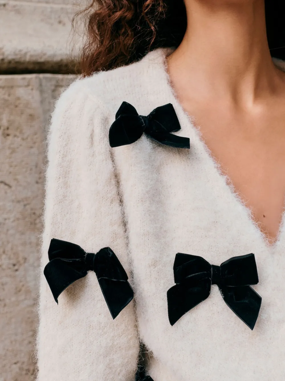Elevate your knitwear collection with this ecru cardigan. The brushed finish gives it a super soft feel, while the charming black velvet bows add a playful touch. With its timeless style and cosy wool blend, it’s the perfect layering piece this season. With wool Brushed finish Velvet bows Long sleeves Machine washable. 65% Polyester, 17% Nylon, 10% Acrylic, 7% Wool, 1% Elastane.