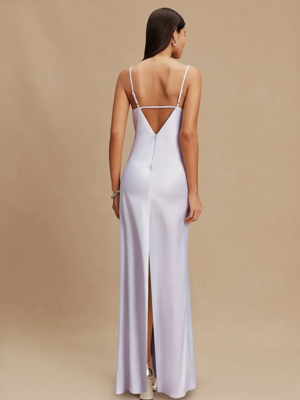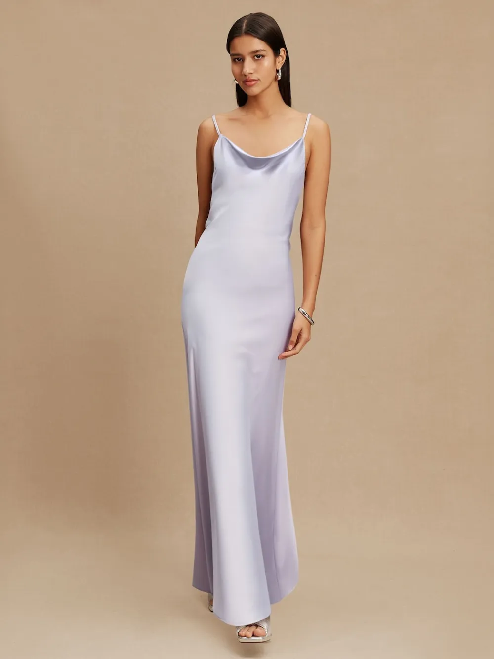 Turn heads in this lavender purple satin cowl neck maxi dress. Perfect for wedding guests, bridesmaids and special occasions. This stunning piece is made from a beautiful lightweight satin fabric for an elegant and flattering fit. The cowl neckline and open back detailing create a stunning silhouette, whilst the back slit and shoulder straps provide comfort and movement. Complete with zip fastening, this maxi number is sure to impress Cowl neck Open back Maxi length Special occasion dress Zip closure Regular side neck to hem 58.5″ / 148cm. Machine washable. 100% Recycled polyester. Items with the curve logo are available in sizes 18 and above., Our tall collection is designed to fit women 5’10” and above. This has been proportionally increased through the body, leg and sleeve to achieve the perfect fit. Available in sizes 8-20.