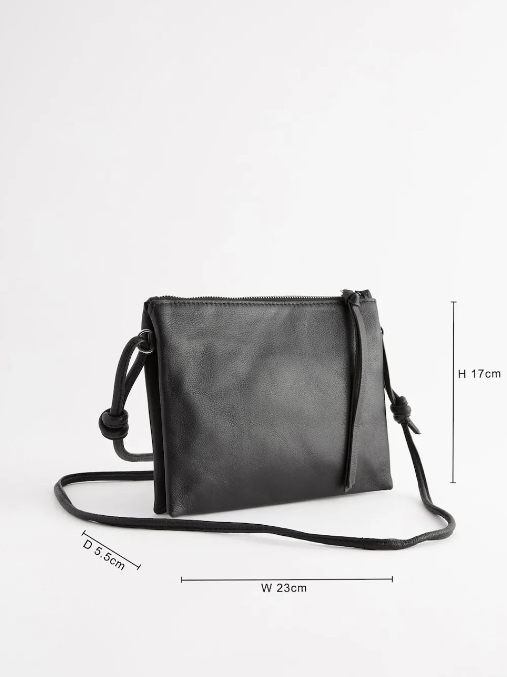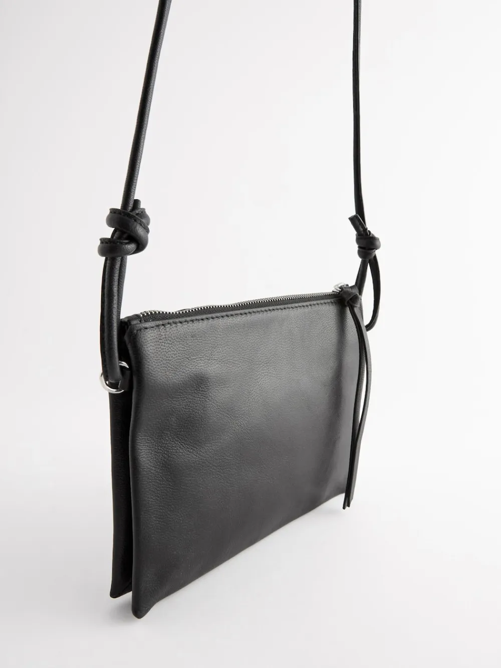 This leather cross-body bag features a sleek minimalist design, with knot and tassel detailing to the slim shoulder strap, finished with a main zippered compartment for your daily essentials. Leather construction Minimalist design Knot tassel detailing Slim shoulder strap Height 17cm Width 23cm Depth 5.5cm Main 100% Leather. Lining 100% Cotton.