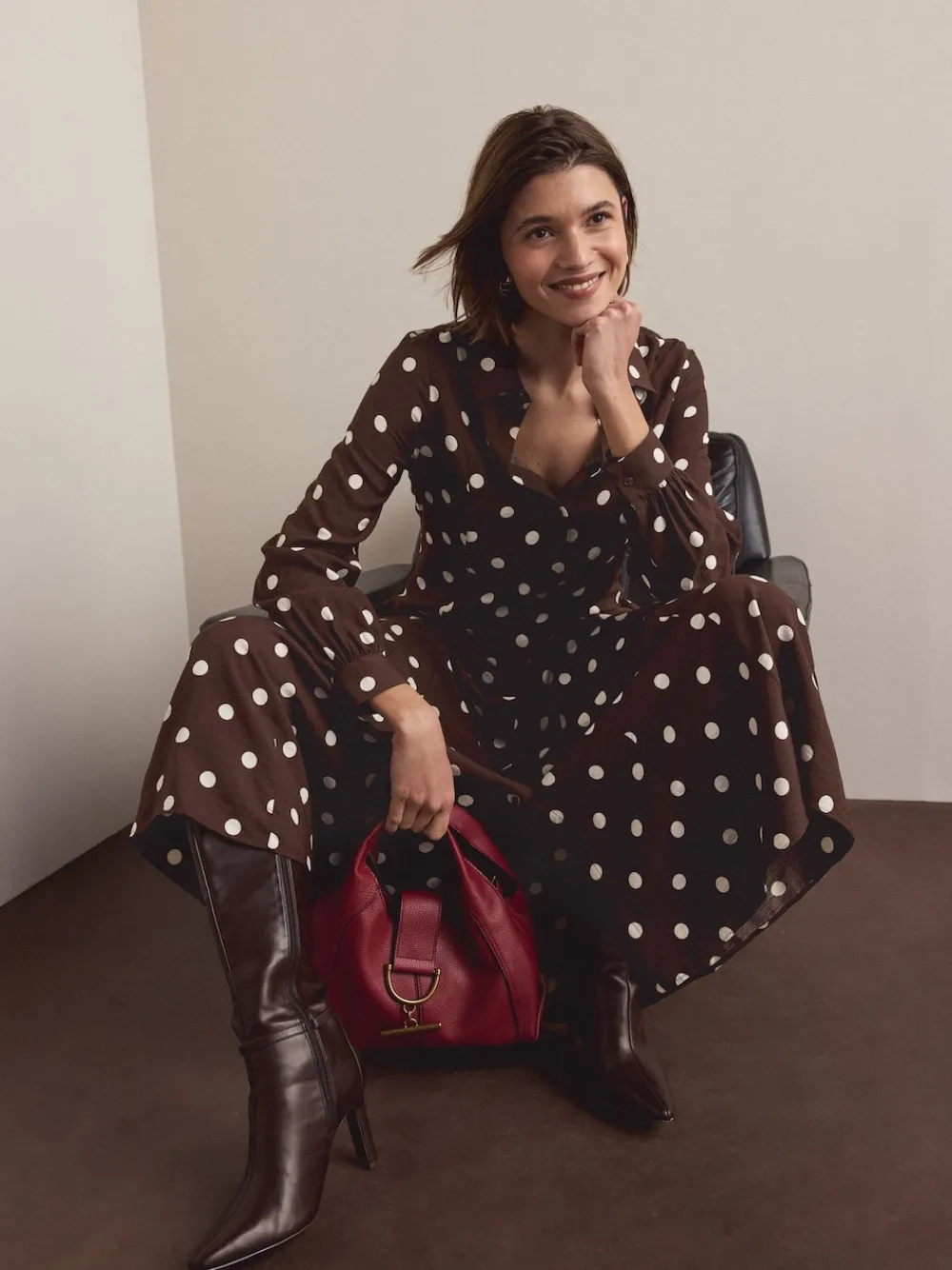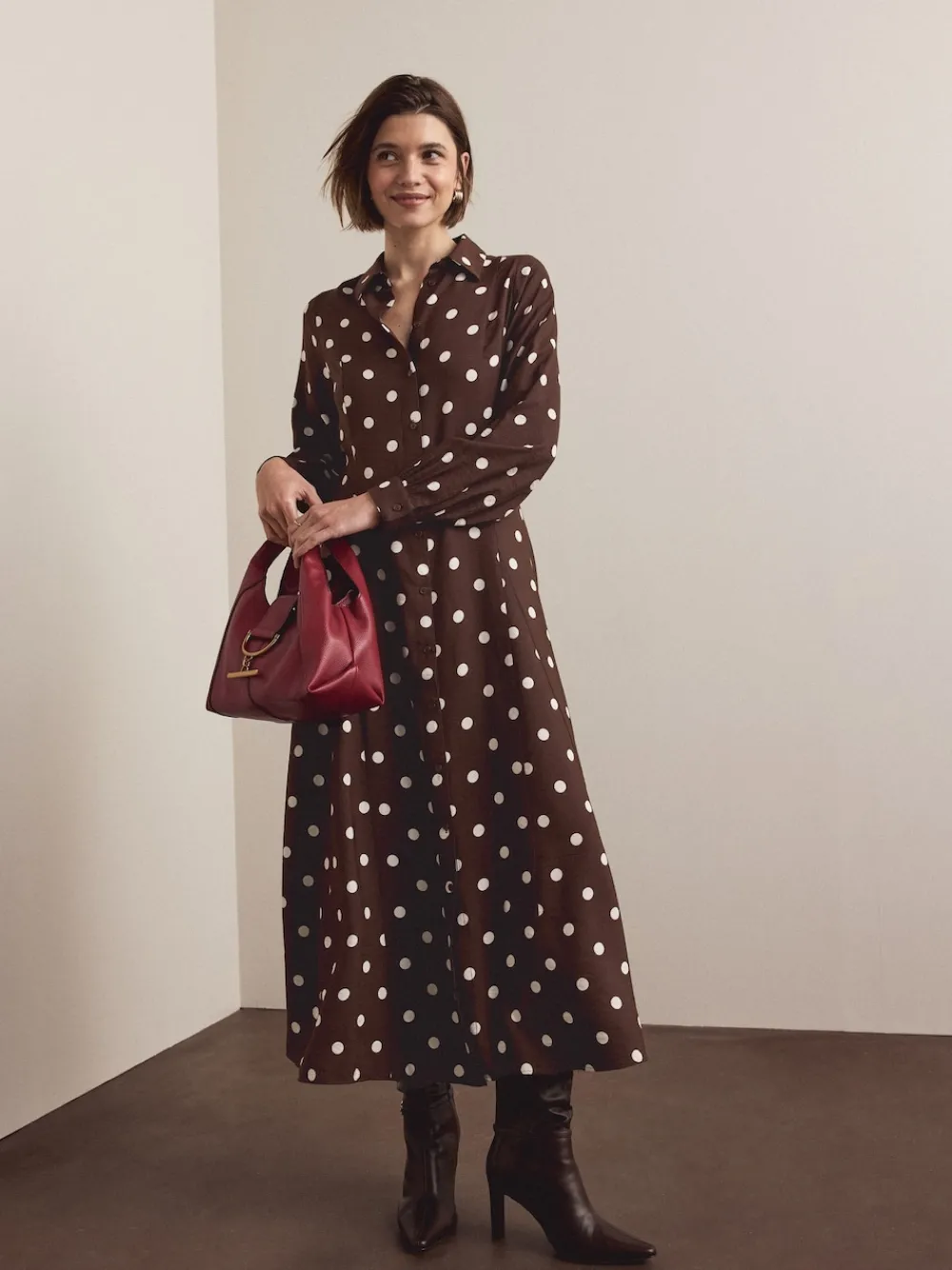 Next Long Sleeve Midi Shirt Dress Chocolate Brown/Ecru Polka Dot Outlet