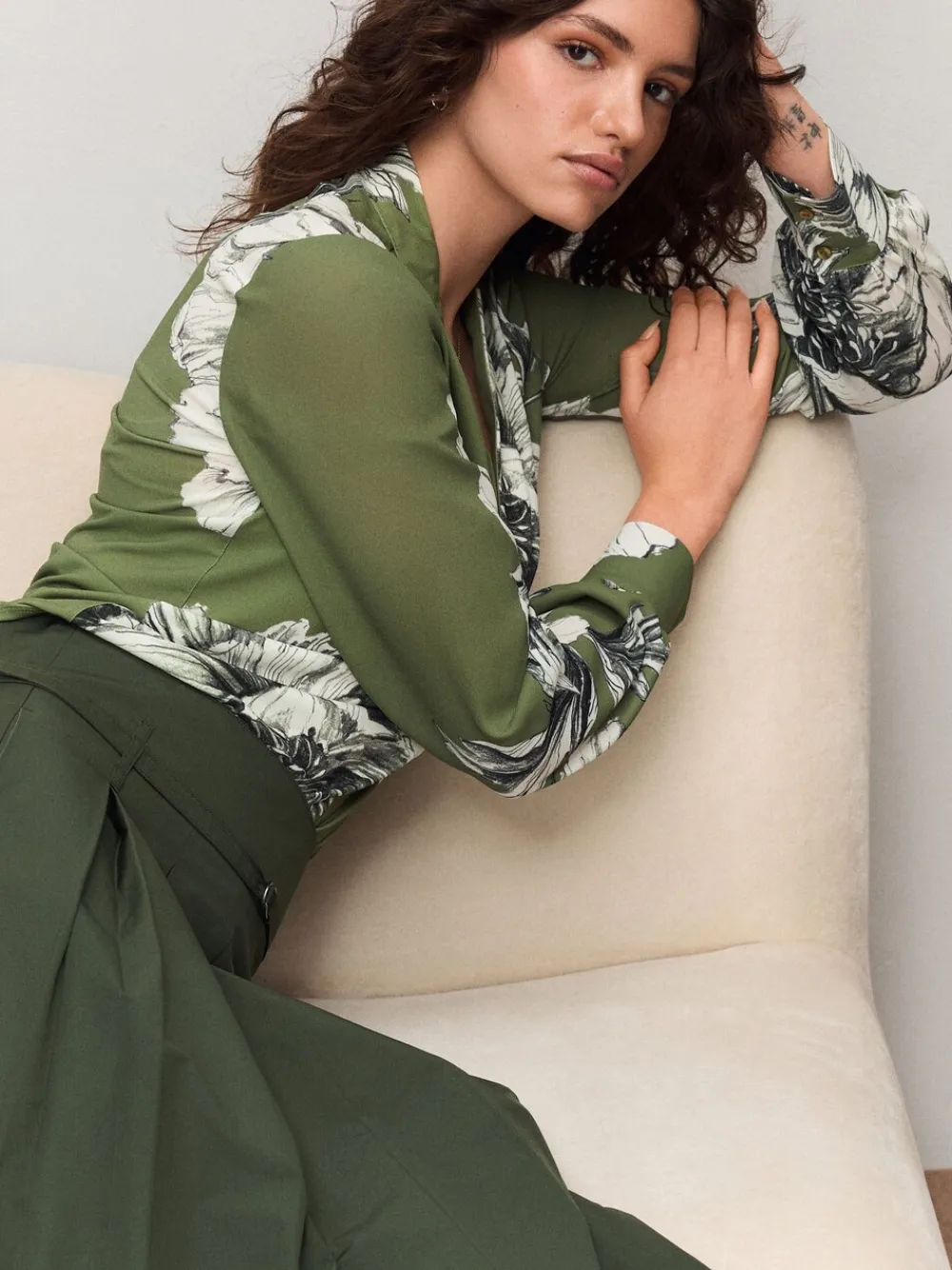 This floral green blouse is a great transitional piece and can be worn from desk to dinner. It features long sleeves and an elegant V-neck design, showcasing a sophisticated floral print. Long sleeved V neck design Floral print Great transitional piece Can be worn desk to dinner Machine washable. Main 90% Recycled polyester, 10% Elastane. Woven 100% Recycled polyester.