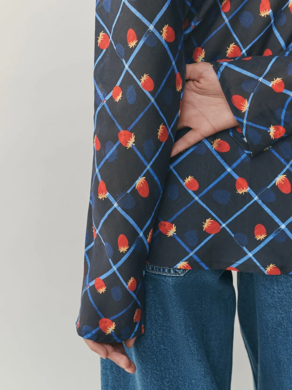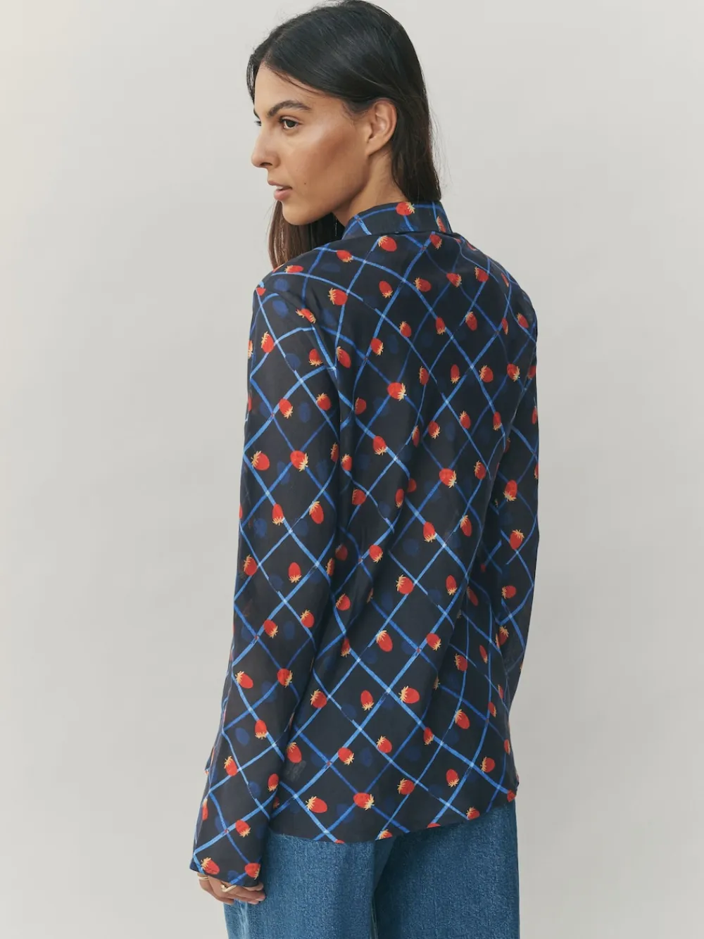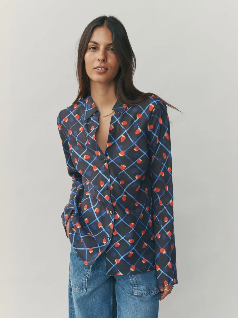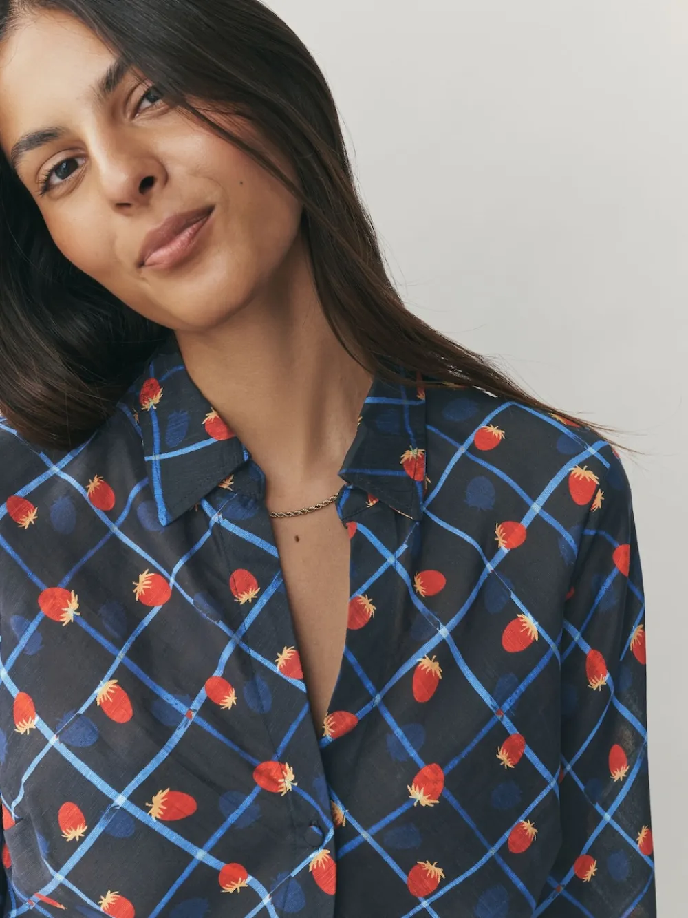 This softly structured shirt is designed to flatter, featuring a fun fruit print layered over a modern checked pattern. The clean, deep V-neckline and elegant long sleeves ensure a polished yet relaxed look.This slightly sheer piece is perfect for injecting playful style into your everyday. Long sleeves Collared V-neckline Button front fastening Checked fruit print Machine washable. 69% Lyocell, 18% Nylon, 13% Linen. Items with the curve logo are available in sizes 18 and above.