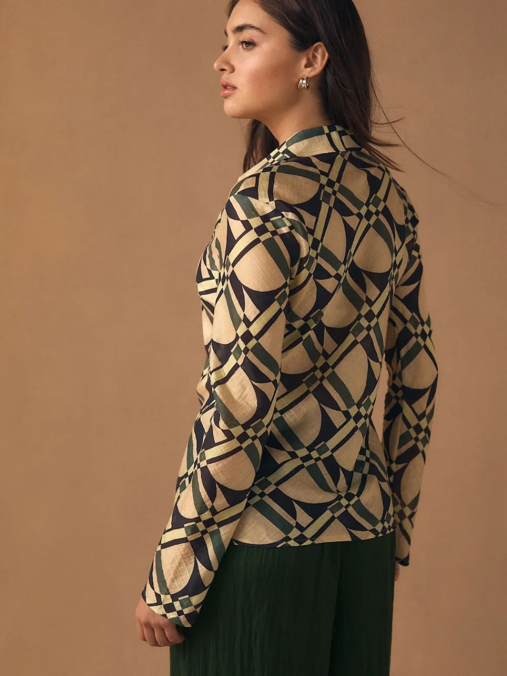 Next Lyocell Blend Collared V-Neck Shirt Cream/Green Geometric Print New