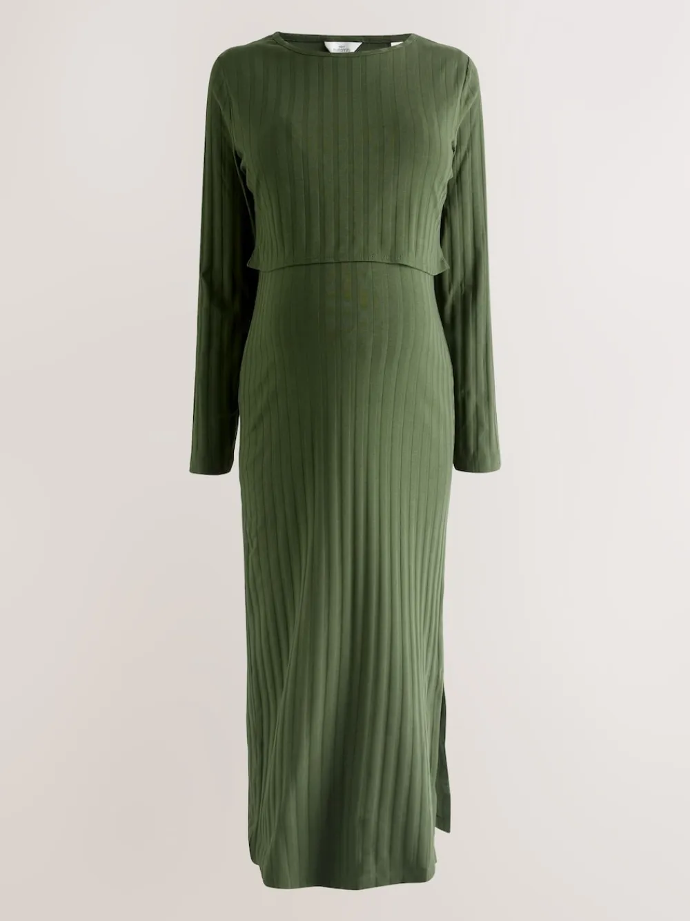 This stylish midi-length dress is perfect for both during and after pregnancy. Crafted from comfortable ribbed fabric, it features a discreet internal nursing layer for easy feeding access. The long sleeves and elegant side split make this a versatile and practical piece for sophisticated everyday wear. Midi length Rbbed fabric Internal nursing layer Long sleeve Side split hem Round neckline Maternity and nursing function 95% Cotton, 5% Elastane.