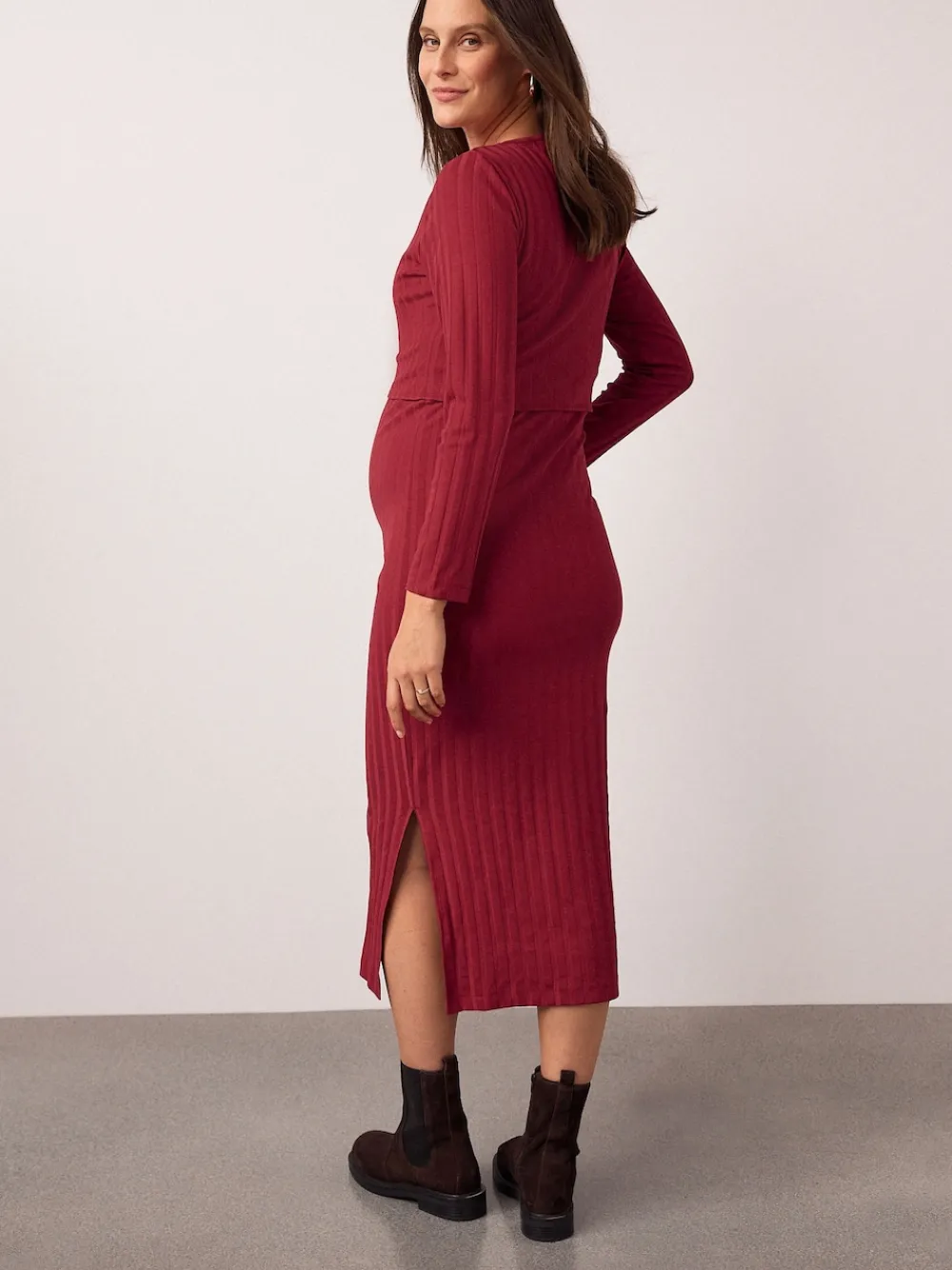 This stylish midi-length dress is perfect for both during and after pregnancy. Crafted from comfortable ribbed fabric, it features a discreet internal nursing layer for easy feeding access. The long sleeves and elegant side split make this a versatile and practical piece for sophisticated everyday wear. Midi length Rbbed fabric Internal nursing layer Long sleeve Side split hem Round neckline Maternity and nursing function 95% Cotton, 5% Elastane.