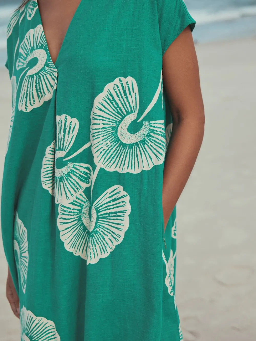 This green floral print Kaftan Mini Dress is the perfect mix of chic and relaxed for summer. Crafted in a lightweight linen-blend, the softly oversized silhouette and gentle V-neck allow you to move freely. Featuring a stylish tile print, short sleeves, useful pockets, and a back pleat detail, this dress is perfect for sundown drinks or your summer holidays. Lightweight linen-blend fabric V-neckline Slightly oversized silhouette With pockets and back pleat detail Regular side neck to hem 36.5″ / 93cm. Machine washable. 55% Linen, 45% Livaeco™ Viscose. Items with the curve logo are available in sizes 18 and above., Our tall collection is designed to fit women 5’10” and above. This has been proportionally increased through the body, leg and sleeve to achieve the perfect fit. Available in sizes 8-20.