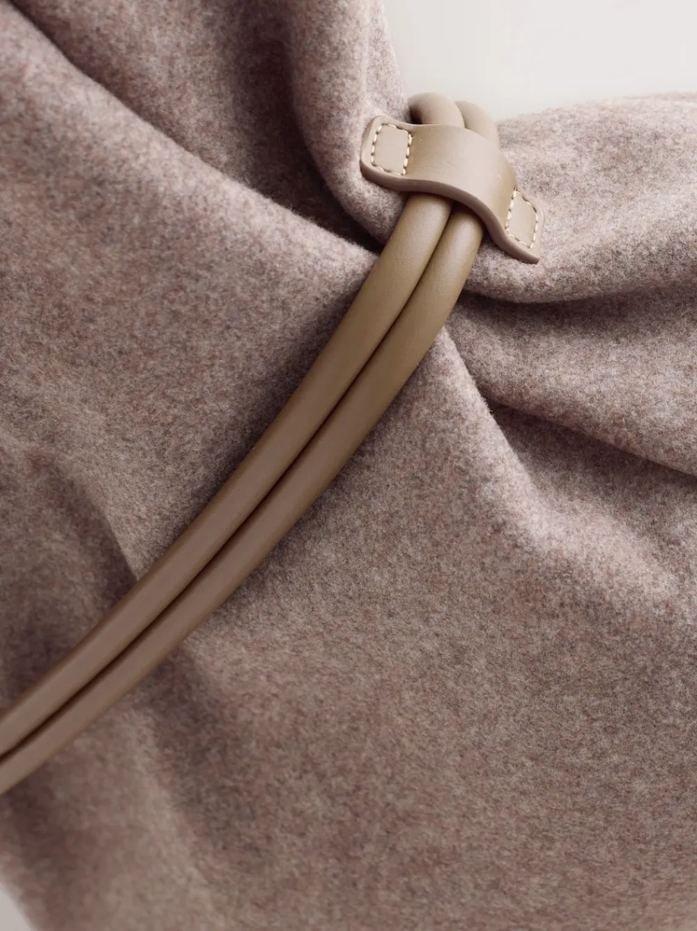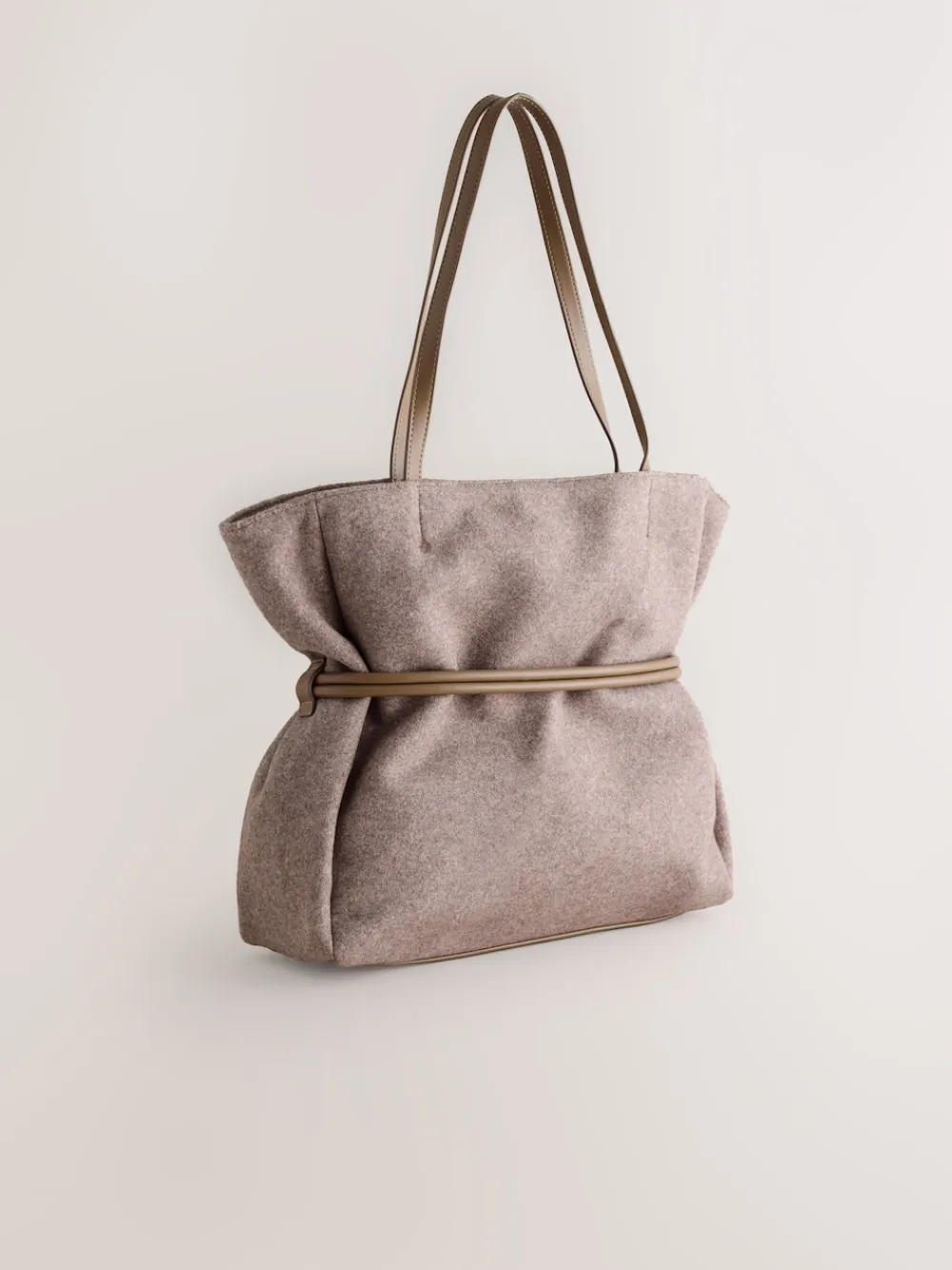 Complete your look with this unique mink brown felt shoulder bag. The soft felt fabric and slouchy shape create a relaxed, on-trend accessory, while the stylish belted detail with gold-toned hardware adds a touch of sophistication. With a secure magnetic clasp opening and two top handles, it’s a versatile choice for your daily essentialsFelt fabric Belted detail Magnetic clasp opening Two top handles Internal pocket Height 39cm Width 48cm Depth 14cm Outer 100% Polyester. Lining 100% Recycled polyester. Trim 100% PU.