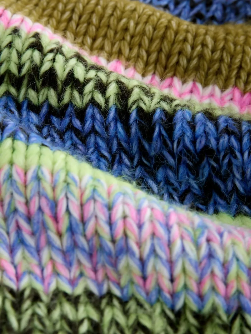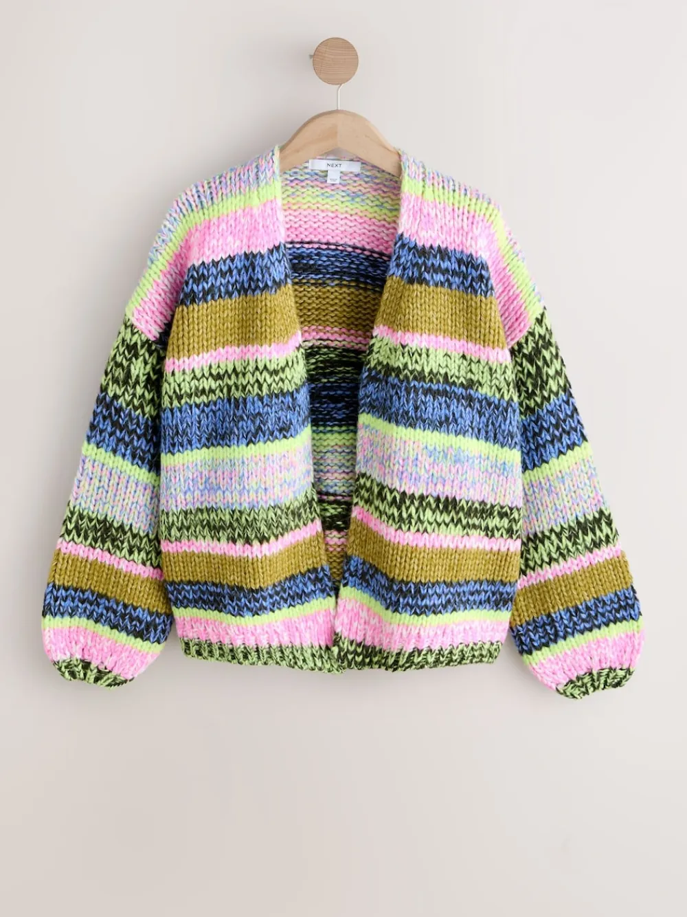 Make a vibrant statement with this multi-coloured chunky knit cardigan. Featuring a bold blue and green stripe pattern, this soft-touch layer is designed with voluminous long balloon sleeves for a modern silhouette. The effortless open-front design makes it a versatile, playful choice for brightening up your casual day-to-night wardrobe. Soft Touch Chunky Knit Stripe Open front/no fastenings Long balloon sleeves Machine washable. 66% Recycled polyester, 24% Acrylic, 5% Nylon, 5% Wool.