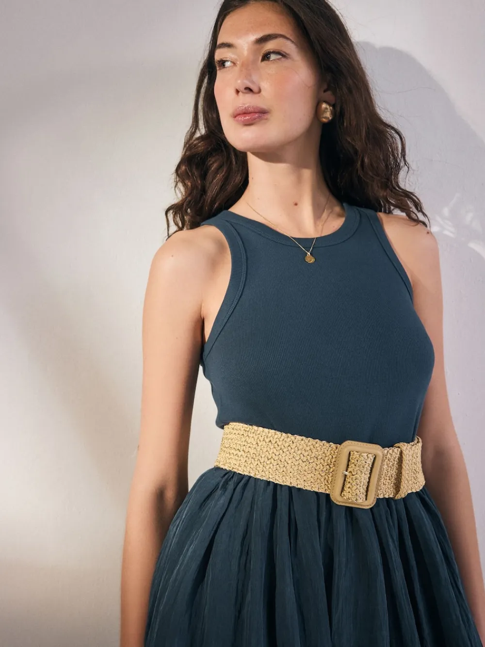This wide waist belt is a great accessory for adding some shape to your outfit, in a gold-effect hue with an oversized buckle and a raffia woven texture. Wide shape Raffia woven texture Chunky buckle Main 57% Polypropylene, 43% Metallised fibre. Trim 100% Polyurethane.