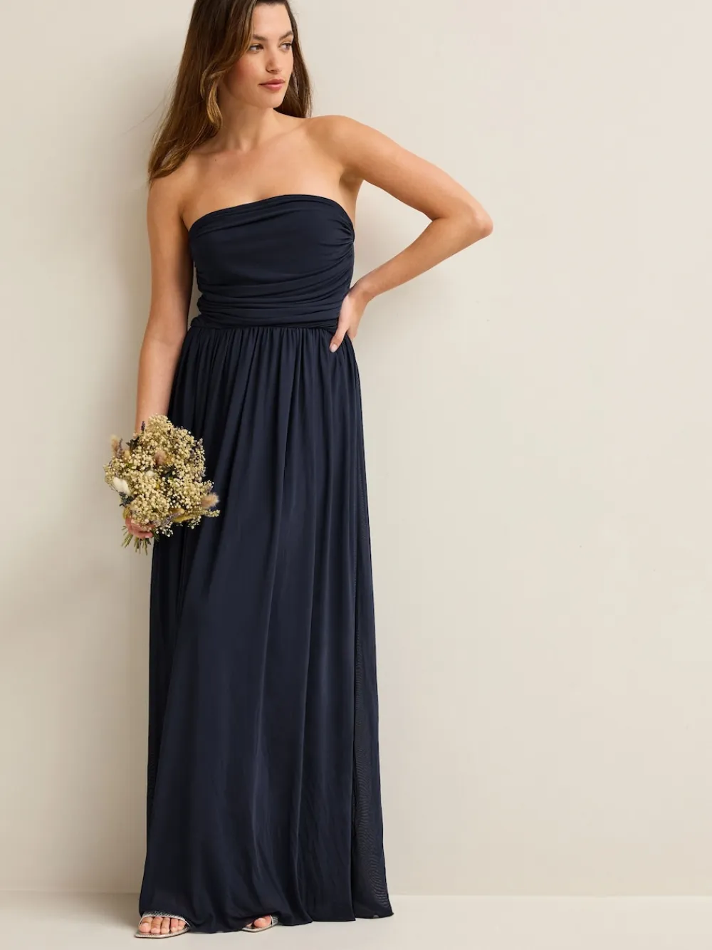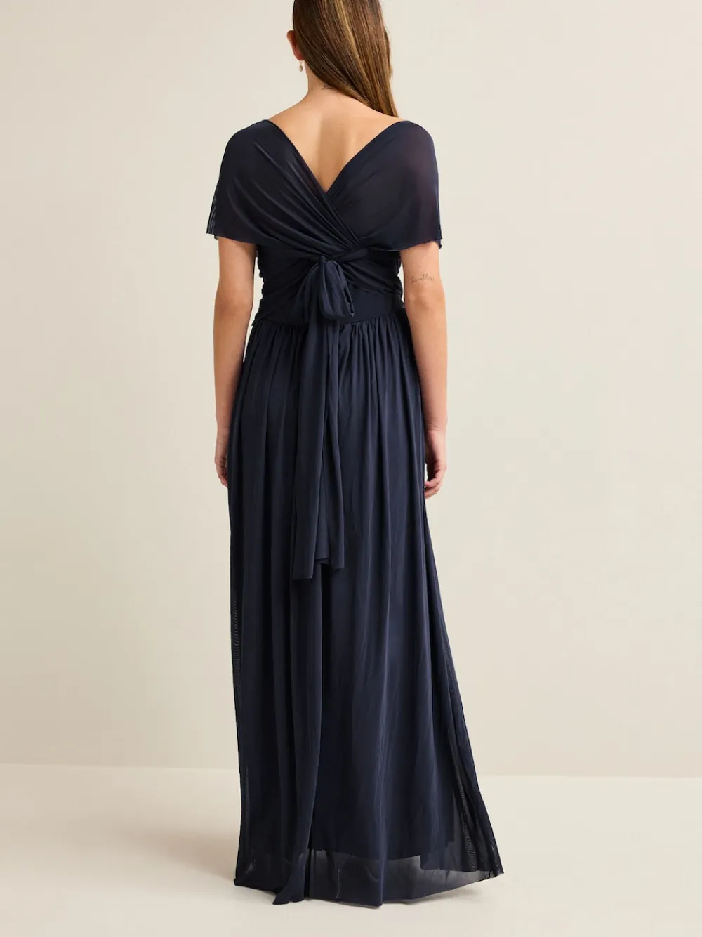 This product has a looser fit than usual. Our multiway wedding guest bridesmaid dress is the ultimate versatile and elegant style. A great choice if you have bridesmaids who all want something different, this multifunctional occasion dress can be styled in a whole host of different ways to create the perfect look.Made from an ultra-comfort mesh overlay with a stretch jersey lining and elasticated ruched waist, they are sure to feel their best for the big day or special occasion. Multiway dress One shoulder Bandeau Halterneck Off shoulder Open back Short sleeve Special occasion dress Regular side neck to hem 51.5″ / 131cm. Machine washable. Main 93% Recycled polyester, 7% Elastane. Lining 100% Recycled polyester. Items with the curve logo are available in sizes 18 and above., Our tall collection is designed to fit women 5’10” and above. This has been proportionally increased through the body, leg and sleeve to achieve the perfect fit. Available in sizes 8-20.