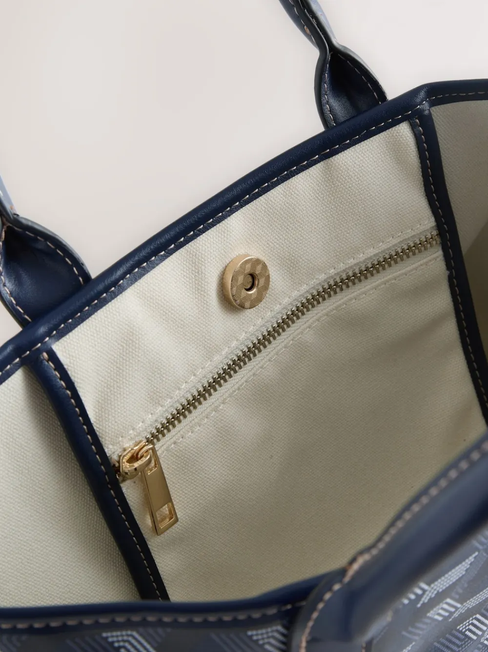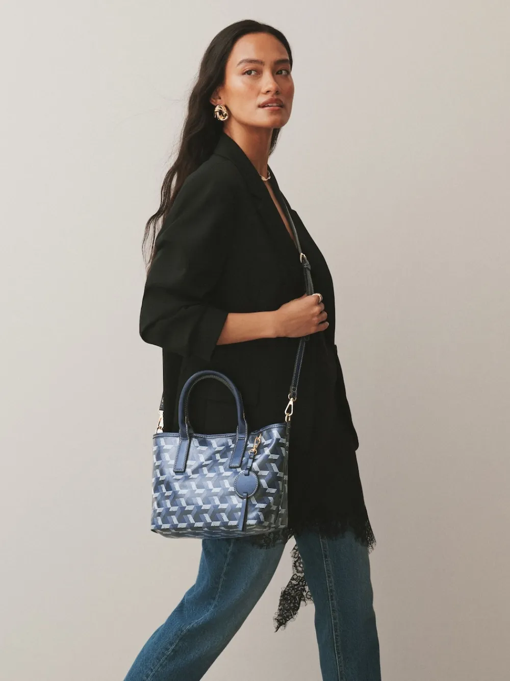 Elevate your accessory game with this Navy Geometric Print Cross-Body Bag. The stylish geometric print and structured silhouette offer a sophisticated, trendy look. Featuring a secure zip fastening and an optional cross-body strap for versatile carrying, this bag is perfect for chic daytime outings and everyday use. Geometric print Zip fastening Optional cross body strap Grab handles Height 20.5cm Width 33cm Depth 13cm Outer 100% Cotton with PU coating. Trim 100% PU.