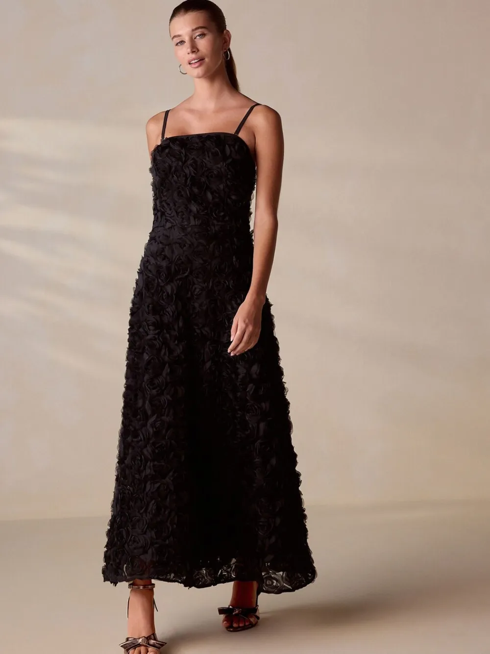 Make an unforgettable entrance in this stunning black occasion 3D floral bandeau maxi dress. Perfect for any formal event, this dress features detachable straps, allowing you to choose between a classic strappy or elegant bandeau look. The 3D floral detailing adds a romantic touch, while the maxi length creates a beautiful, flowing silhouette. 3D floral detailing Bandeau neckline Detachable straps Maxi length Machine washable. Main 100% Polyester. Lining 100% Cotton. Items with the curve logo are available in sizes 18 and above., Our tall collection is designed to fit women 5’10” and above. This has been proportionally increased through the body, leg and sleeve to achieve the perfect fit. Available in sizes 8-20.