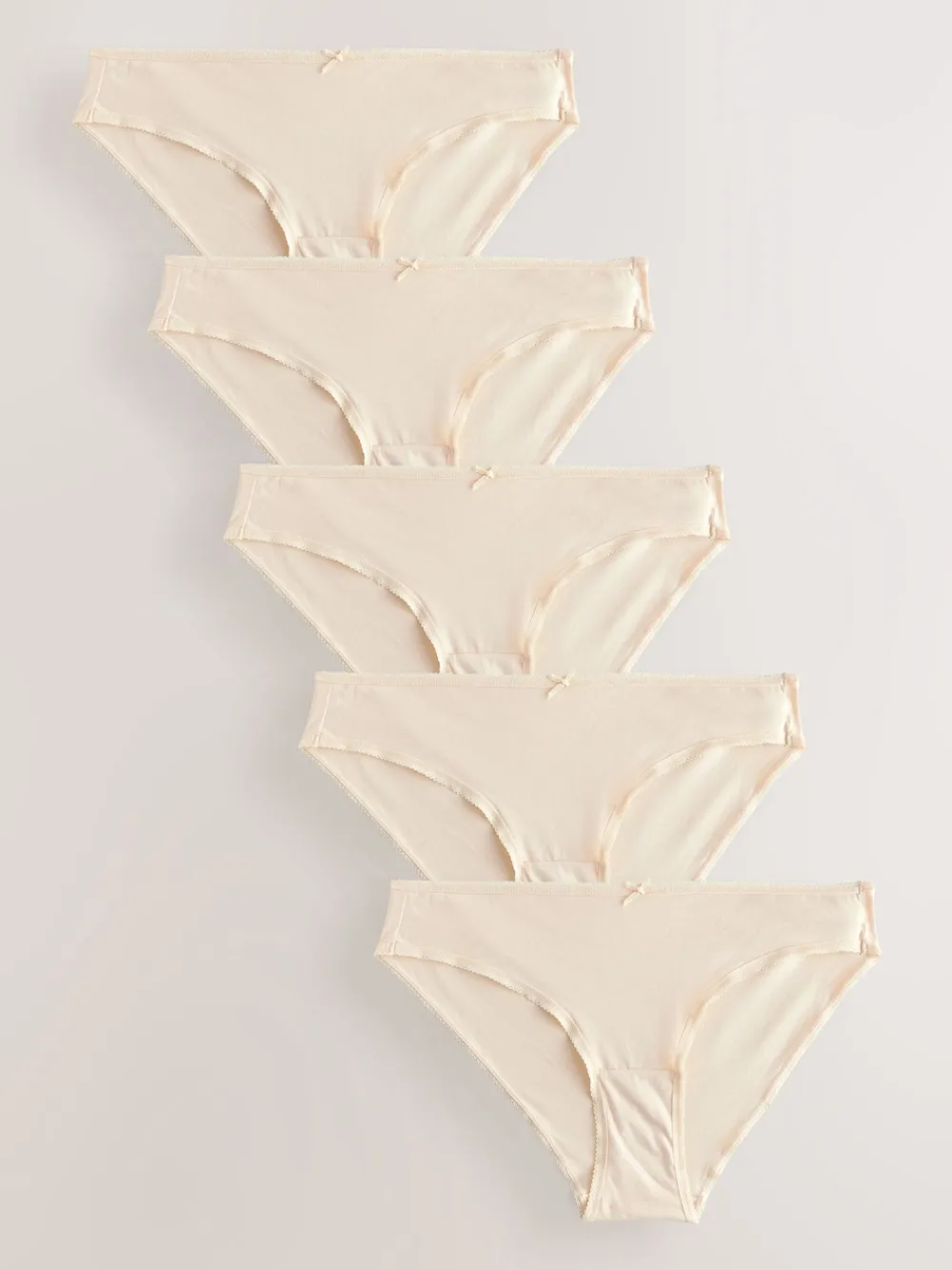 Our bestselling everyday knickers. Naturally breathable cotton for all day comfort. Comes in a range of pack size, shape and colour to suit all customers. Machine washable. 5 x Knickers Main 95% Cotton, 5% Elastane. Gusset 100% Cotton. Items with the curve logo are available in sizes 18 and above.