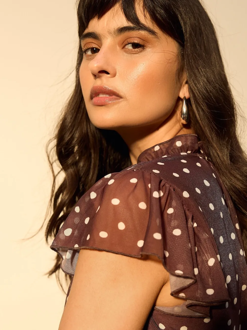 Ideal for special occasions, this short sleeve dress has a flattering V-shaped neckline with ruffle sleeves, a ruched wrap waist and an all-over polka dot print. Mesh fabric V-shaped neckline Ruffle sleeves Pleated Polka dot print Regular side neck to hem 53″ / 135cm. Machine washable. Main 95% Recycled polyester, 5% Elastane. Lining 100% Recycled polyester. Items with the curve logo are available in sizes 18 and above., Our tall collection is designed to fit women 5’10” and above. This has been proportionally increased through the body, leg and sleeve to achieve the perfect fit. Available in sizes 8-20.