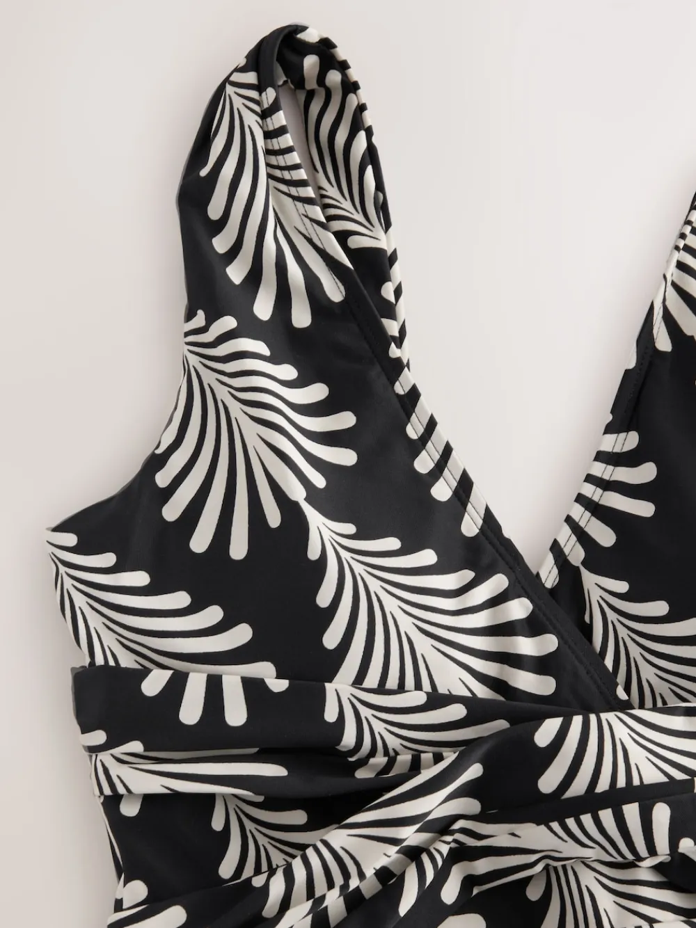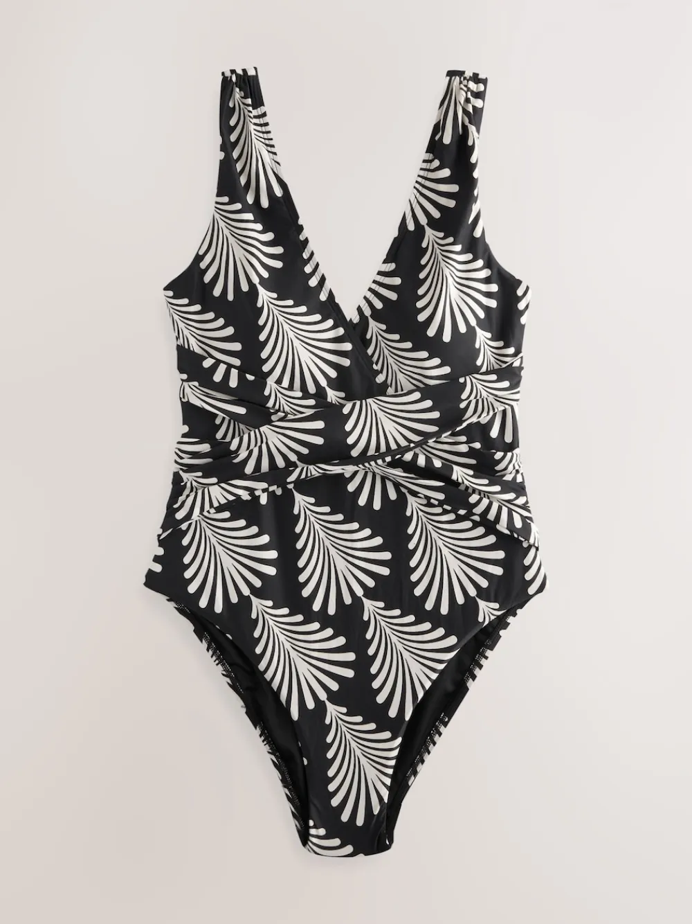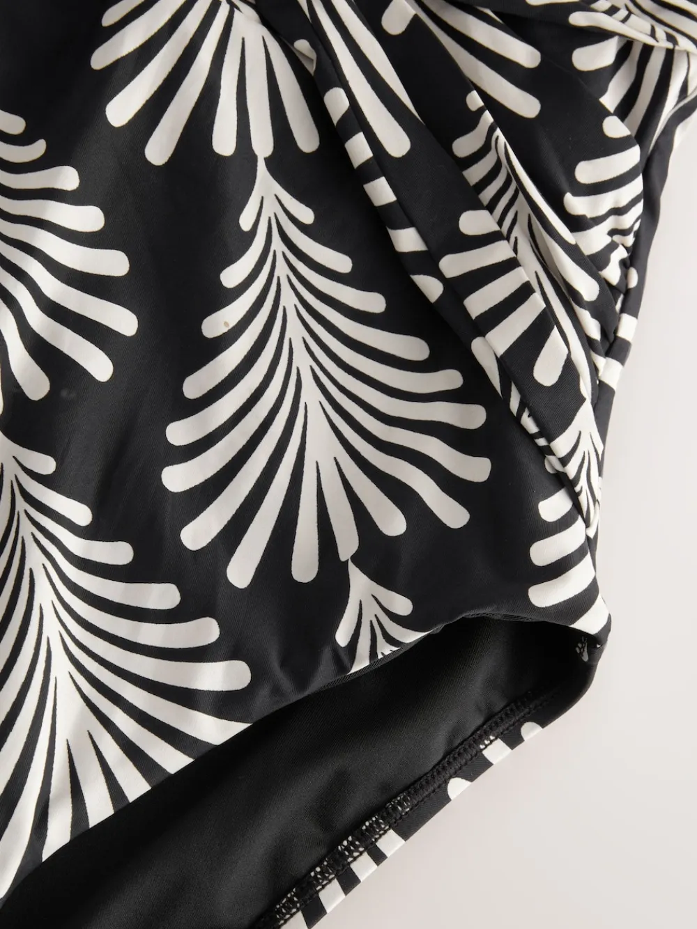 Our black and cream fan print swimsuit is designed with tummy control. Detailed with tummy mesh panelling to enhance your figure, the drape detailing and plunge neckline help to accentuate your curves, leaving you comfy and confident poolside. Complete with SPF 50+ coated fabric to keep you protected from the sun. Plunge neckline Tummy mesh panelling Draped silhouette SPF 50+ fabric Main 85% Nylon, 15% LYCRA® XTRA LIFE™ elastane. Lining 92% Recycled polyester, 8% Elastane. Mesh 88% Nylon, 12% Elastane. Items with the curve logo are available in sizes 18 and above., Our tall collection is designed to fit women 5’10” and above. This has been proportionally increased through the body, leg and sleeve to achieve the perfect fit. Available in sizes 8-20., LYCRA® XTRA LIFE™ fibre keeps your underwear looking new for longer, with lasting comfort and fit. This innovative stretch fabric is lightweight and breathable and will hold its shape wear after wear, wash after wash. , This fabric complies with BS EN 13758 – 1, providing protection against solar ultraviolet radiation. It has been independently tested and given a UPF rating of 50+ which blocks more than 97.5% of UV rays. Important Advice: • Sun exposure causes skin damage • Only covered areas are protected • Always use a high protection factor sunscreen on any exposed areas of skin • The protection offered by this fabric may be reduced with use or if stretched or wet • Always rinse in fresh water after each use • Fabric provides UVA +UVB protection from the sun.