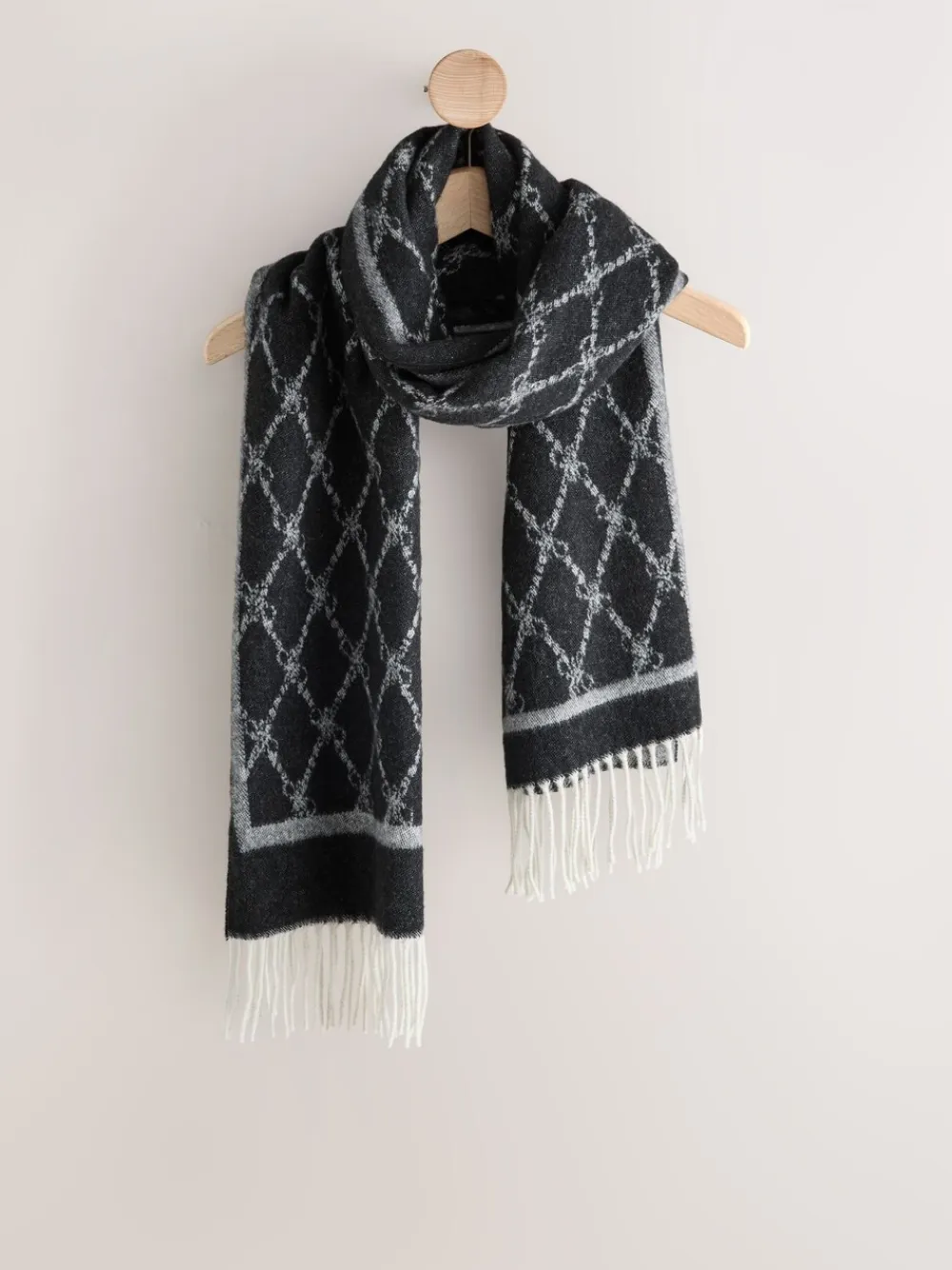 Next Premium Made in Italy Jacquard Monogram 100% Wool Midweight Scarf Grey/Black Clearance