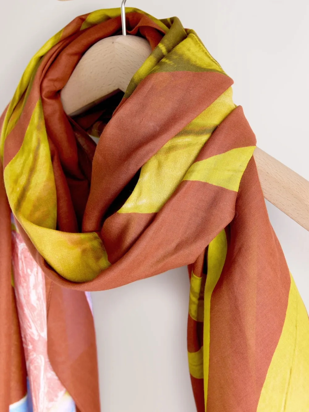 Add a vibrant pop of colour to any outfit with this lightweight scarf. Featuring a striking rust tropical print combining warm oranges, bold pinks, and lime greens, this accessory is perfect for day-to-night styling. Its smooth, fine fabric ensures fluid draping, making it ideal for layering or wearing as a statement piece. Rust tropical print Lightweight fabric base Versatile styling accessory Length 180cm Width 70cm 100% Cotton.