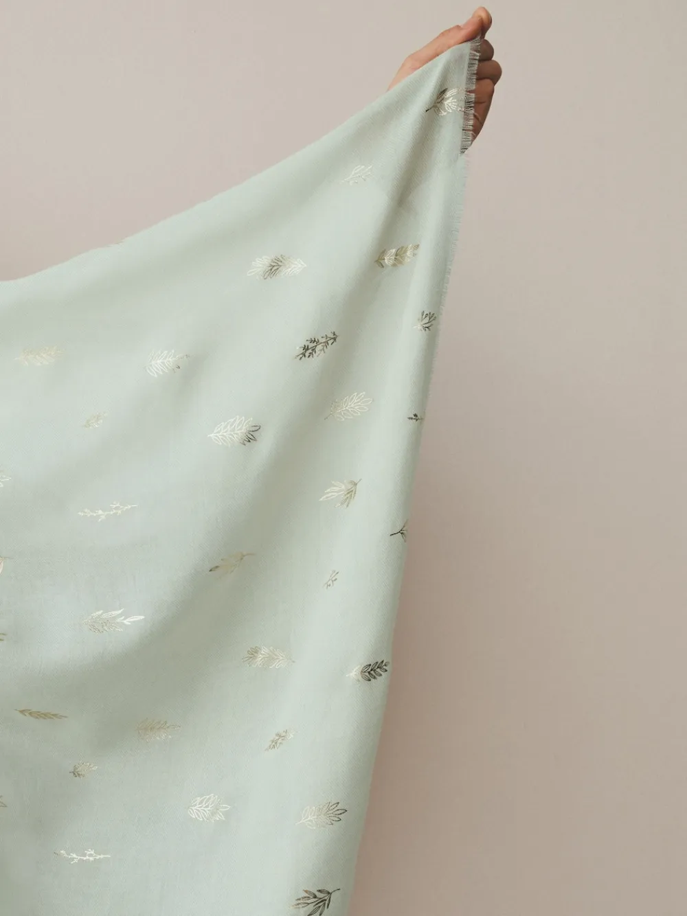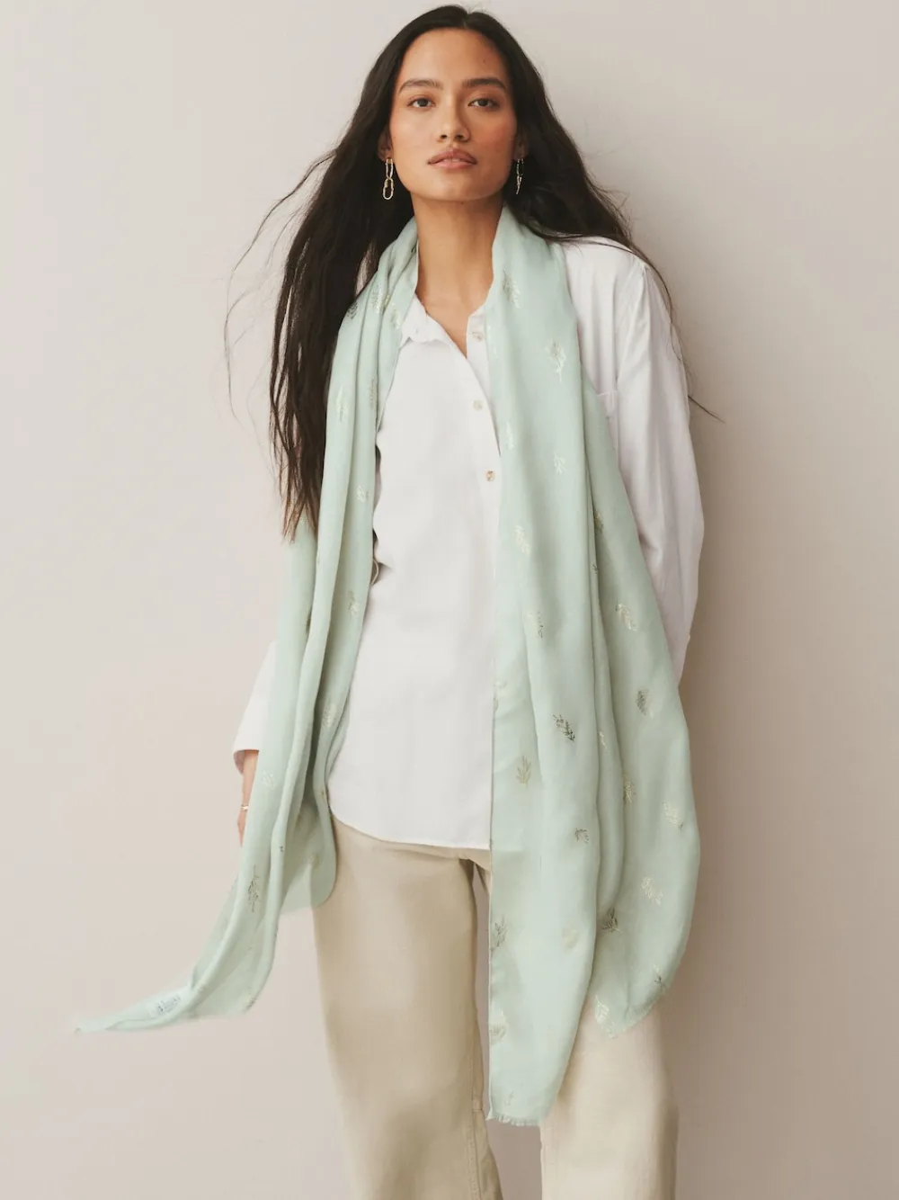 Add a subtle touch of glamour to your ensemble with this elegant lightweight scarf. The soft sage green base is beautifully detailed with scattered gold foil accents for a gentle shimmer. Its flowing, airy fabrication makes it a perfect versatile layer for any smart-casual occasion. Lightweight Scattered gold foil detailing Soft, airy fabrication Length 180cm Width 70cm 100% Recycled polyester.