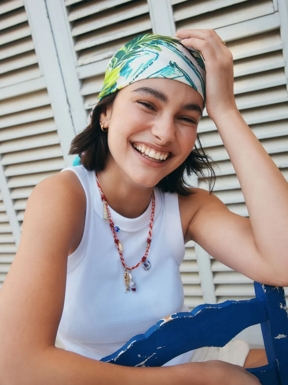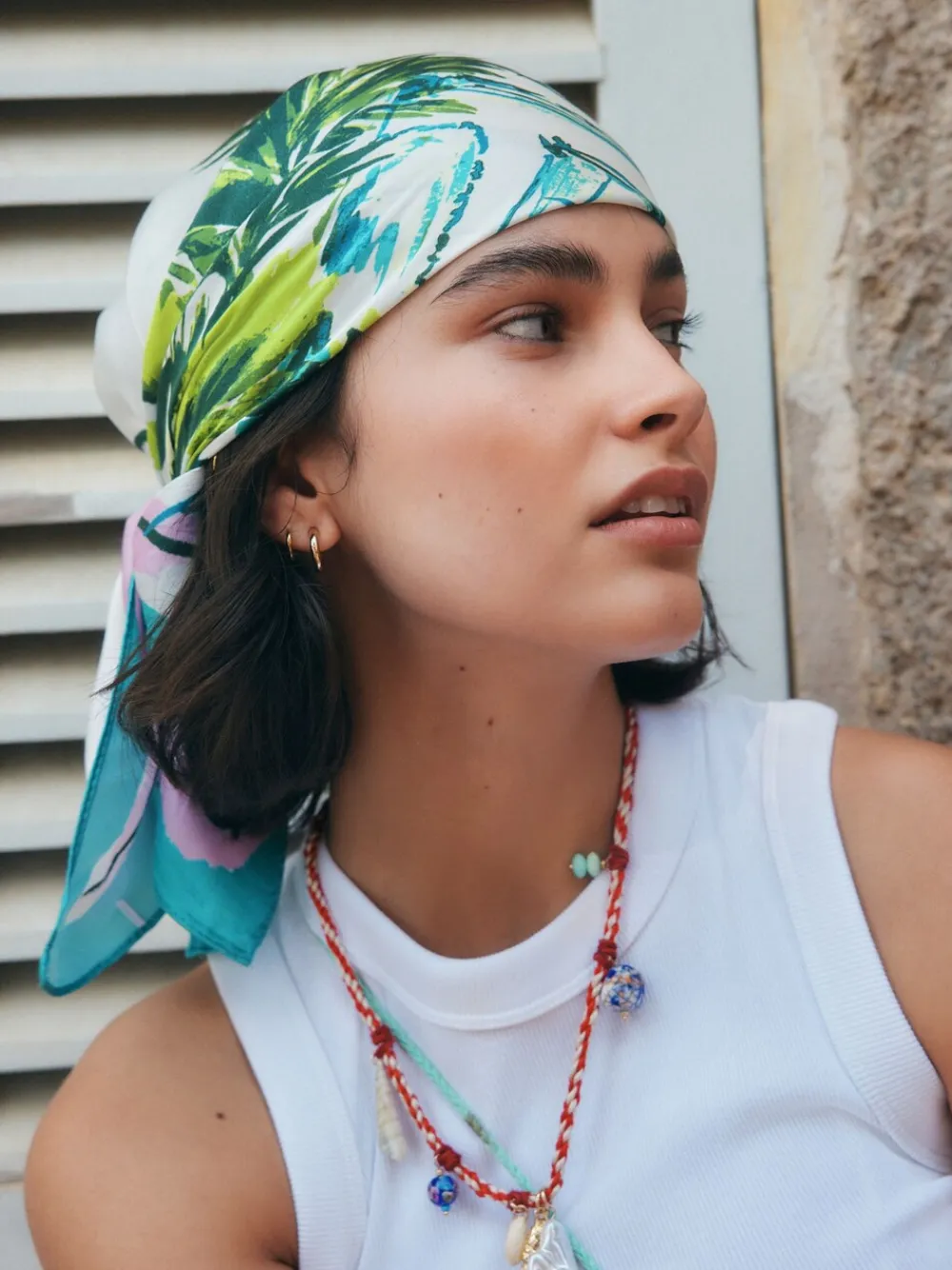Transport yourself to warmer climates with this beautiful poolside scene square scarf. Crafted from smooth, fluid satin, the vibrant print features a house, palm trees, and a pool, framed by contrasting blue and pink zig-zag borders. Perfect for accessorising your resort wear or adding a chic pop of colour. Smooth satin fabric Poolside scene print Square shape Vibrant blue and pink borders Length 70cm Width 70cm 100% LENZING™ ECOVERO™ Viscose.