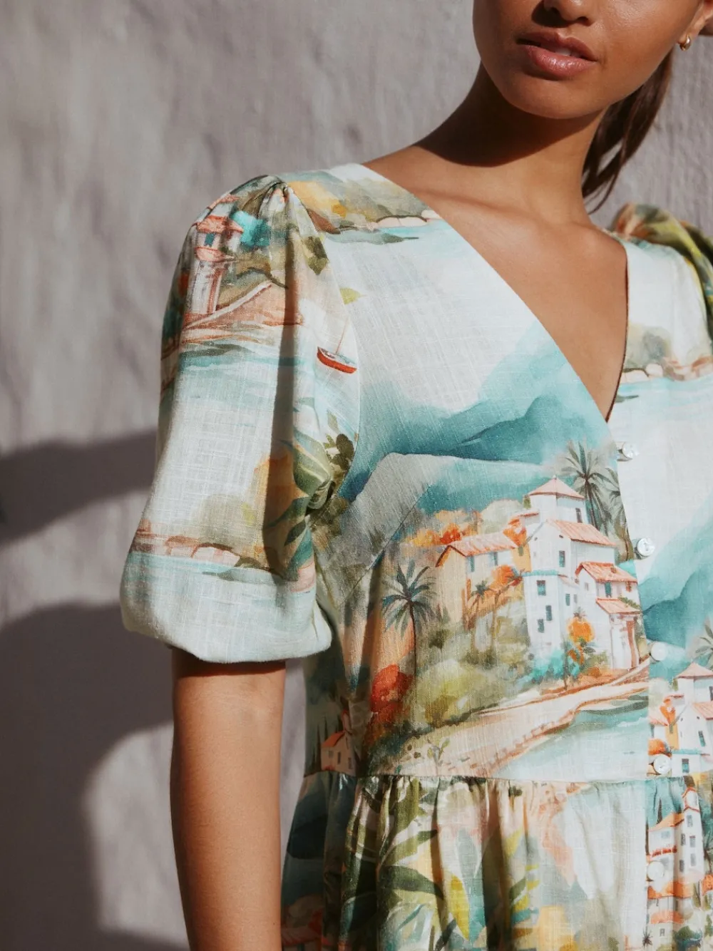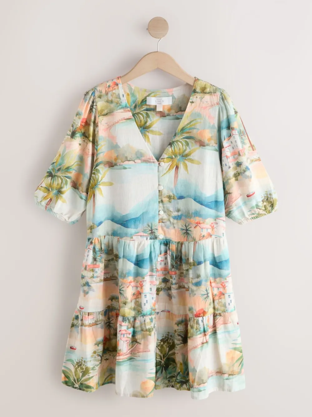 Slip into holiday mode with this dreamy printed dress. Its soft, flowy linen blend fabric and easy tiered silhouette make it your go-to piece for sunset strolls or seaside lunches. Light, comfortable, and complete with a flattering V-neckline and functional side pockets. Short sleeves Button through Tiered mini dress Linen blend Pockets Regular side neck to hem 34″ / 86cm. Machine washable. 70% TENCEL™ lyocell, 30% Linen. Items with the curve logo are available in sizes 18 and above., Our tall collection is designed to fit women 5’10” and above. This has been proportionally increased through the body, leg and sleeve to achieve the perfect fit. Available in sizes 8-20.