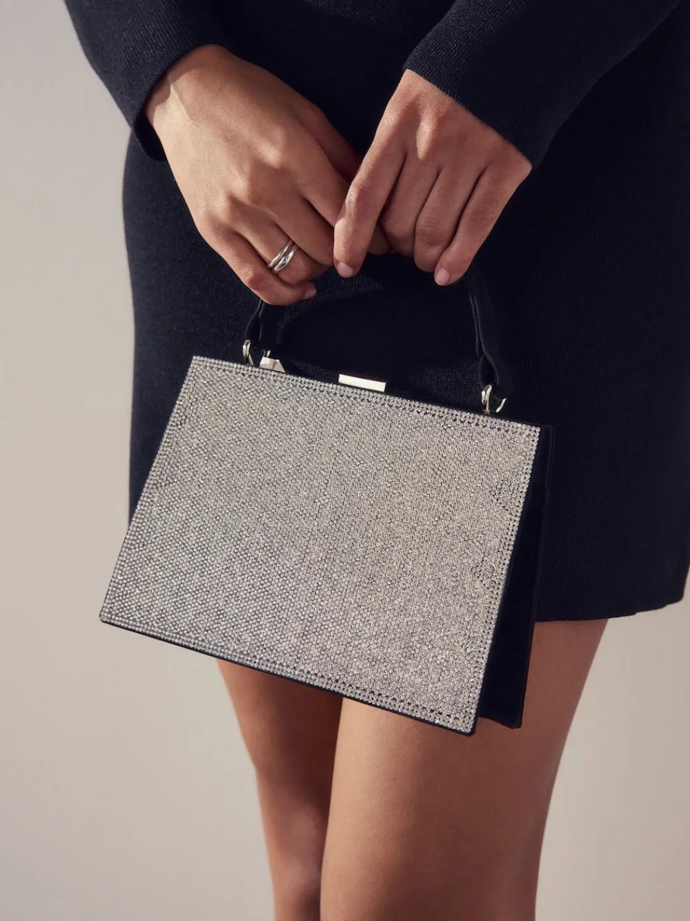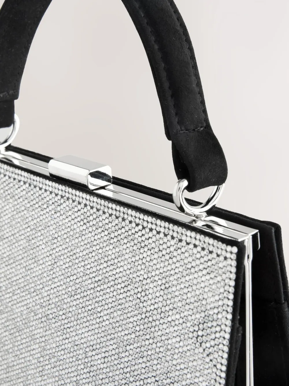Step out in style with this glamorous silver sparkle hand-held bag. The structured shape and all-over embellishment create a dazzling look, perfect for adding a touch of sparkle to a special occasion outfit. Finished with a secure clasp fastening and a comfortable handle, it is the perfect accessory for a night out. Embellished finish Structured shape Clasp fastening Hand-held bag Internal pocket Height 14cm Width 20.5cm Depth 6cm Outer 100% Polyester. Lining 100% Recycled polyester.