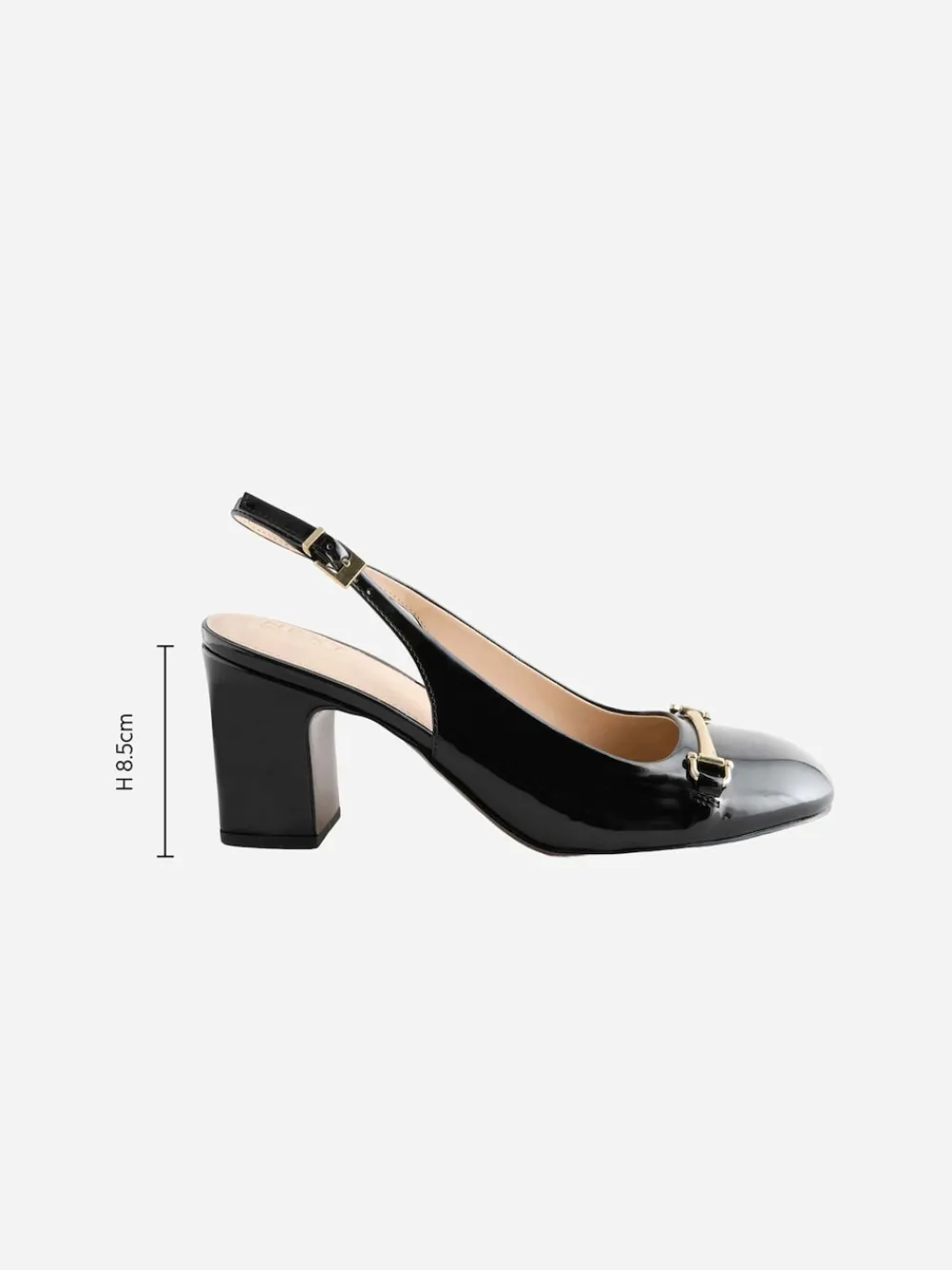 These stylish slingback heels are available in a standard or wide fit, featuring a rounded closed toe and hardware detailing to the front, a Forever Comfort® cushioned footbed and a block heel. Round toe Slingback strap Forever Comfort® footbed Block heel Heel height 8.5cm. Upper – Other Materials, Lining & Sock – Other Materials, Sole – Other Materials.