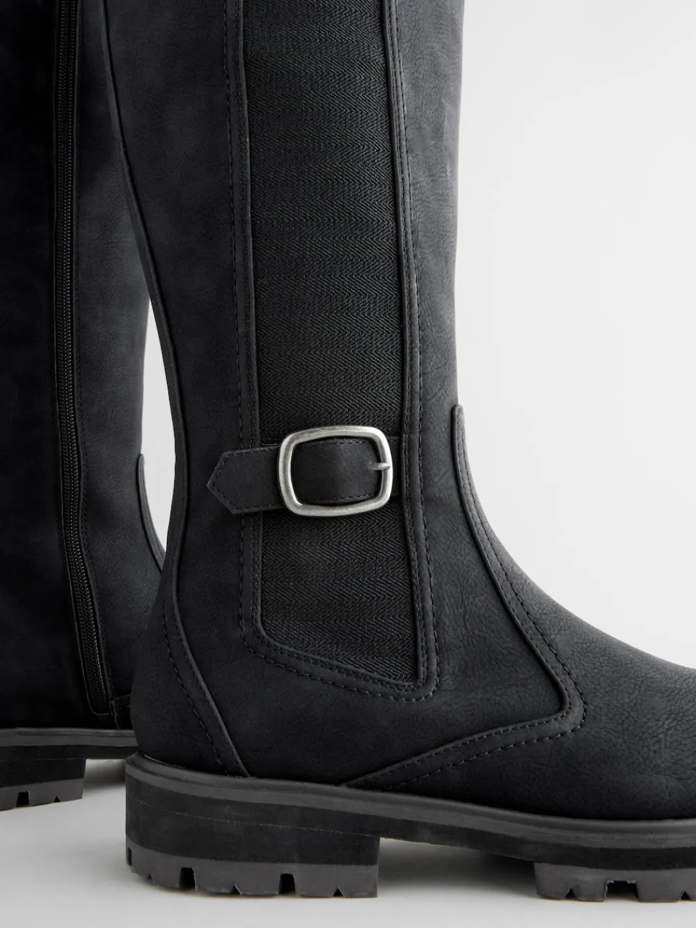 These black knee-high boots features a Chelsea-inspired design with a faux suede upper, an elasticated side panel and a zippered fastening for easy wear, alongside a buckle and strap. A Forever Comfort® cushioned footbed provides comfort in every step, finished with a durable outsole. Regular width Faux suede upper Stretchy side panel Zippered fastening Round toe Buckle and strap detail Forever Comfort® footbed Durable outsole Upper – Other Materials, Textile, Lining & Sock – Textile, Other Materials, Sole – Other Materials. Wide fit shoes and short ankle boots provide extra width across the foot. Wide fit long boots provide extra width across the foot and through the leg at the calf.