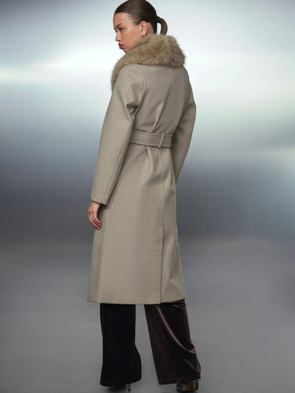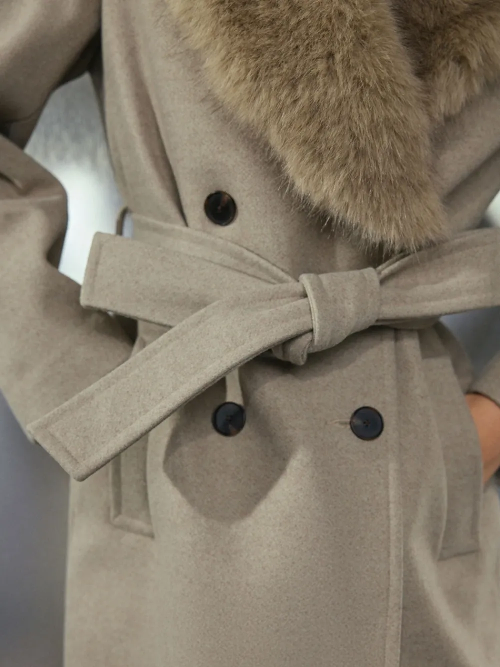 Achieve versatile cold-weather elegance with this stone-coloured coat. Featuring a detachable faux fur collar and a flattering belted waist, the double-breasted detailing ensures a chic silhouette. Perfect for elevating any smart occasion or everyday look. Detachable faux fur collar Detachable belted waist Double breasted detailing Front pockets Long length Regular centre back neck to hem 47″ / 120cm. Specialist dry clean. Shell 93% Polyester, 7% Viscose. Lining 100% Recycled polyester. Trim 100% Polyester. Items with the curve logo are available in sizes 18 and above.