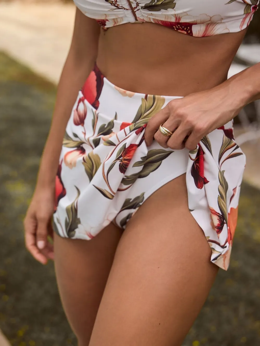 A swim skirt, paired with matching bikini bottoms and a coordinating bikini top, provides slightly more coverage. You can wear it high-waisted to flatter the waist or low waist for more modesty by the beach Swim mini skirt Floral print Elasticated waistband Pleated More coverage Water-resistant Main 85% Recycled polyester, 15% LYCRA® XTRA LIFE™ elastane. Lining 92% Recycled polyester, 8% Elastane. Items with the curve logo are available in sizes 18 and above.