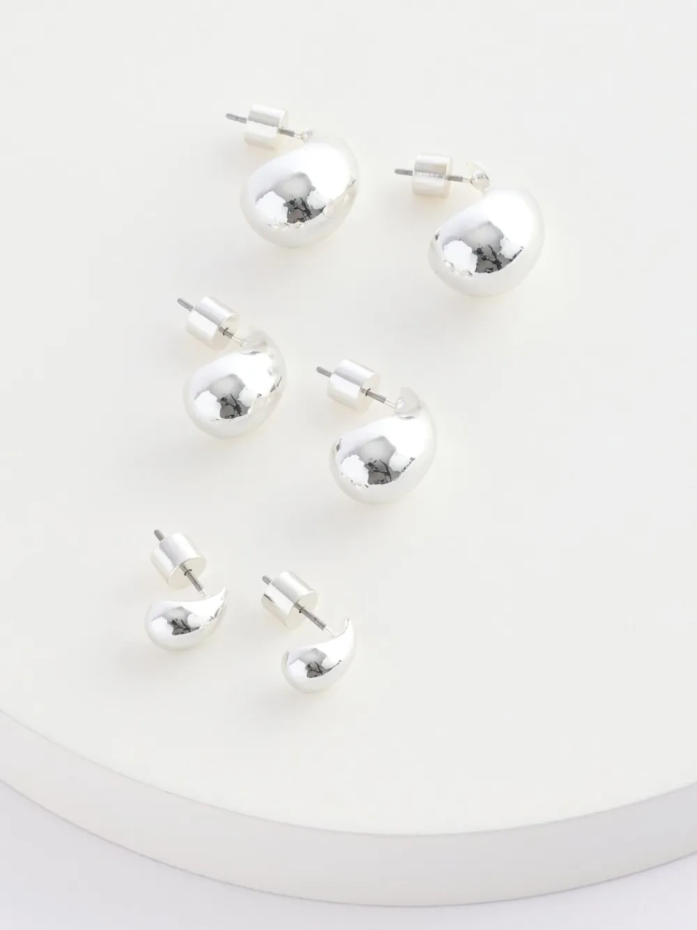 This 3-pack of silver-tone earrings feature a teardrop design that’s perfect for everyday or formal wear. Please note: Pierced earrings cannot be returned or exchanged due to hygiene reasons. 3-pack Silver-tone Teardrop design 85% Recycled zinc, 10% Recycled brass, 5% Steel.