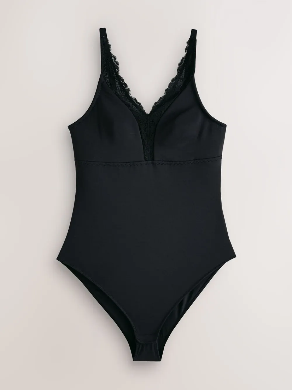 Feel comfortable and supported all day in this black shaping bodysuit. The supersoft modal fabric and non-wired design offer ultimate comfort, while the lace detailing and seamless fit provide a sleek, chic look. It’s the perfect foundation for any outfit, offering total support without the need for padding or wiring. Supersoft modal fabric Non-wired Lace detailing Total Support Ultimate Comfort Shaping Machine washable. 63% Modal, 25% Nylon, 12% Elastane.