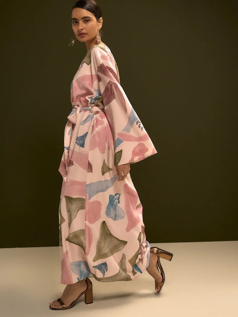 Next V-Neck 3/4 Length Sleeve Maxi Kaftan Dress Pink Floral Print Best