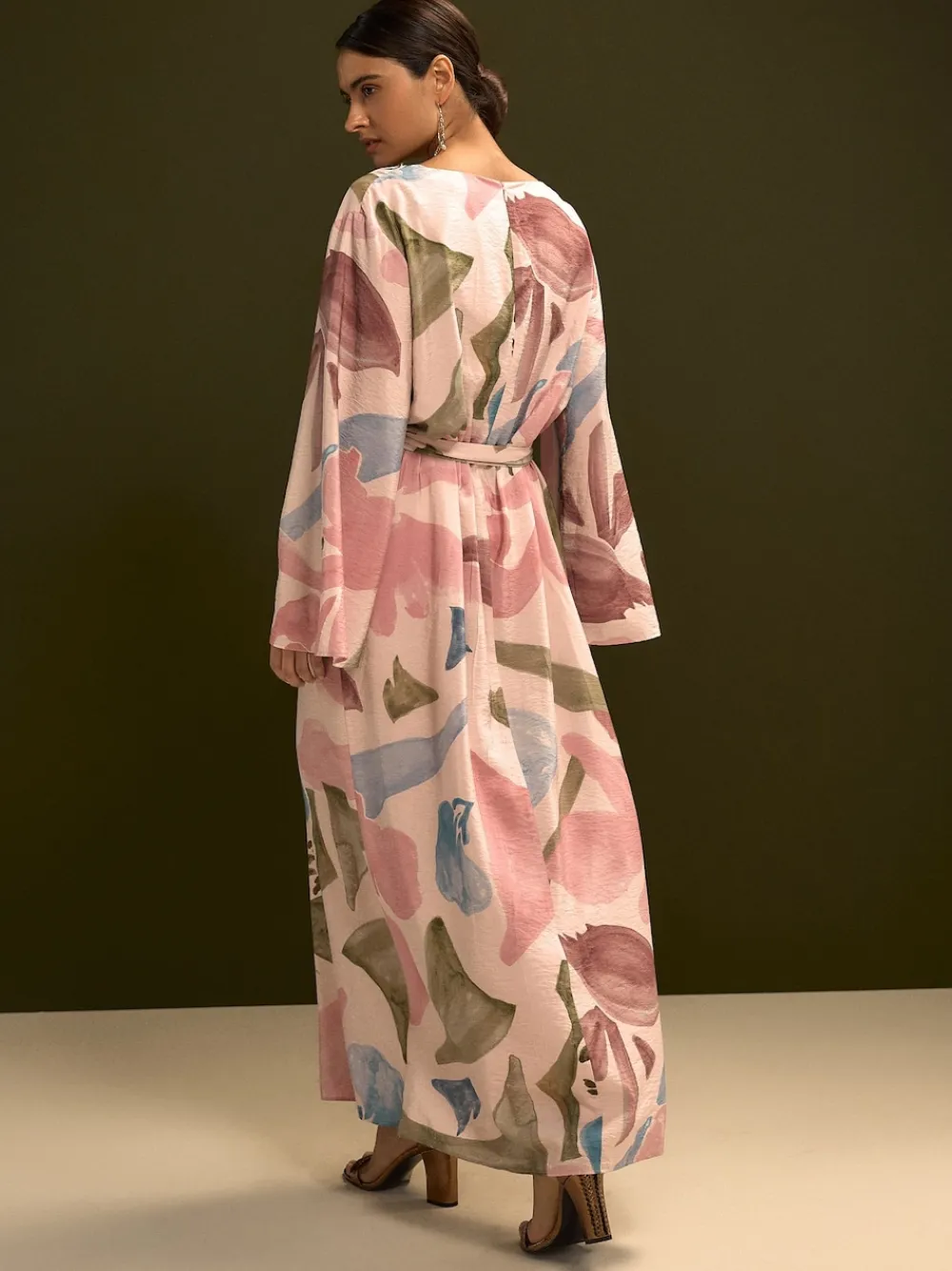 Unlock effortlessly chic resort-style glamour in this flowing maxi kaftan. The soft, draped fabric and relaxed silhouette ensure all-day comfort, while the striking print is perfect for Eid dressing or your next holiday vacation. Dress Maxi V-Neck Kaftan Sleeves Print Regular side neck to hem 55″ / 140cm. Machine washable. 84% Livaeco™ Viscose, 16% Nylon.