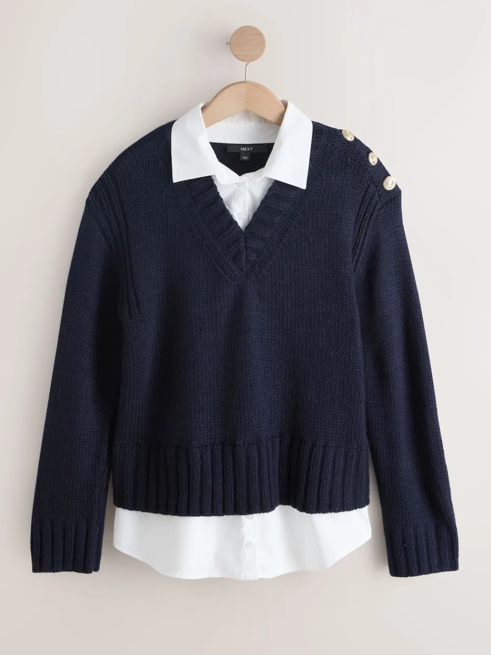 Achieve an effortlessly polished look with this layered jumper, designed to give the sophisticated appearance of a shirt worn under a knit. This clever 2-in-1 piece features a soft V-neck knitted jumper with long sleeves and a deep ribbed hem and cuffs. The design is elevated by a crisp white collar and matching hemline for a classic preppy aesthetic, finished with decorative gold-tone metal buttons along one shoulder for a touch of refined detail. V-neck knitted jumper with shirt layer look Contrasting white shirt collar and hem Decorative gold-tone metal shoulder buttons Long sleeves with ribbed cuffs Flattering deep ribbed hemline Machine washable. Main 90% Acrylic, 10% Wool. Woven 100% Cotton.