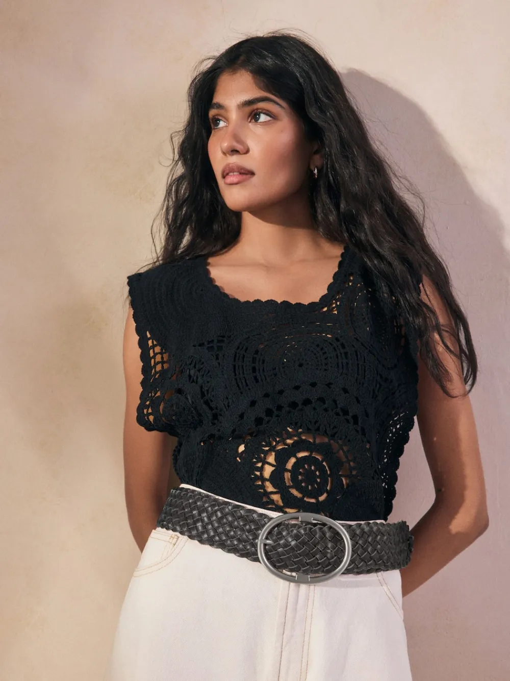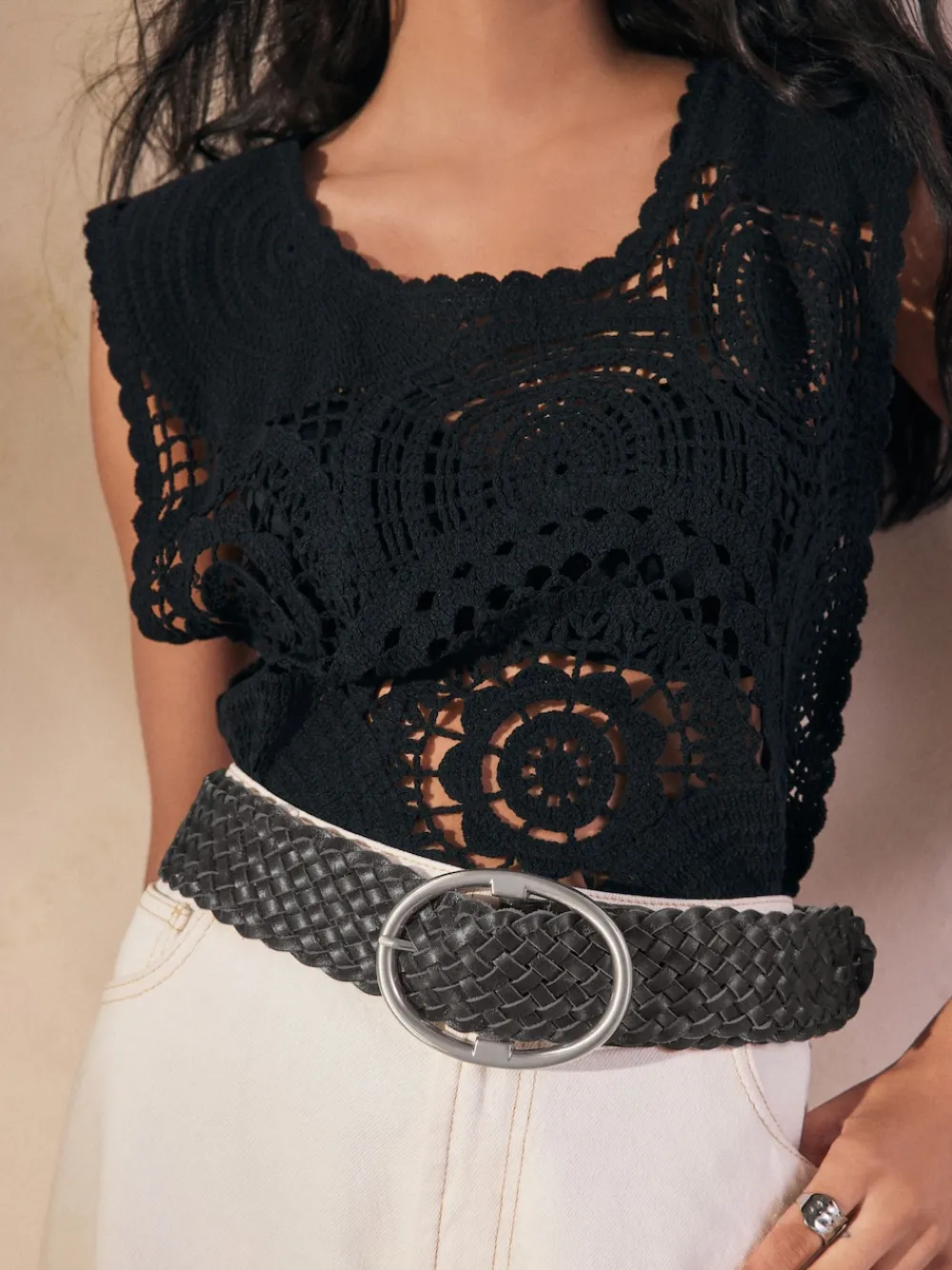 This stylish wide belt has a Western-inspired design, featuring hand woven leather detailing to the strap and an oversized metal buckle. Wide shape Oversized buckle Hand-woven leather strap 100% Leather.