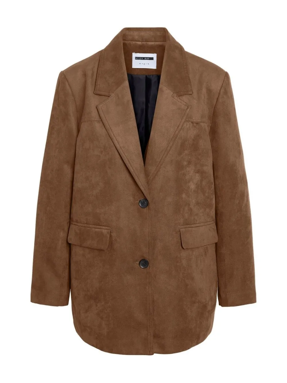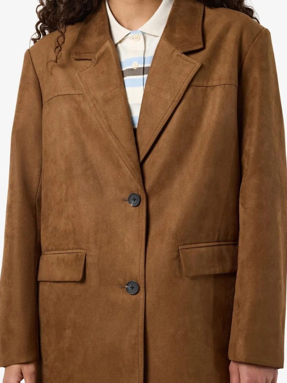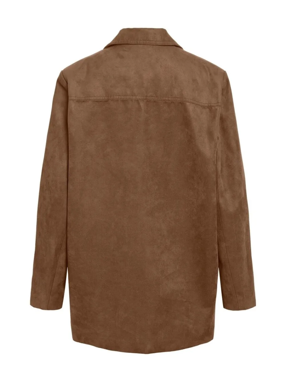 Oversized long-sleeved suede blazer with front pockets and button closing in brown caramel. Machine washable. 100% Polyester.